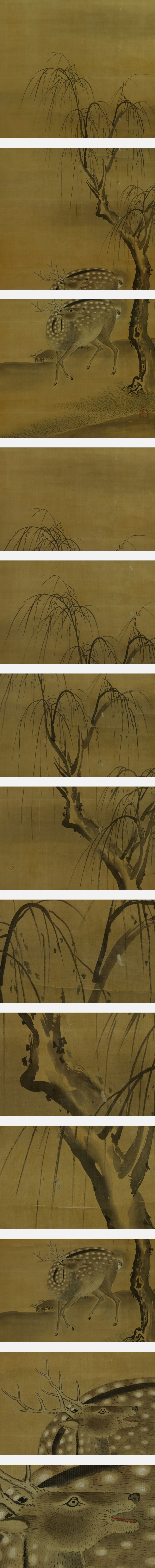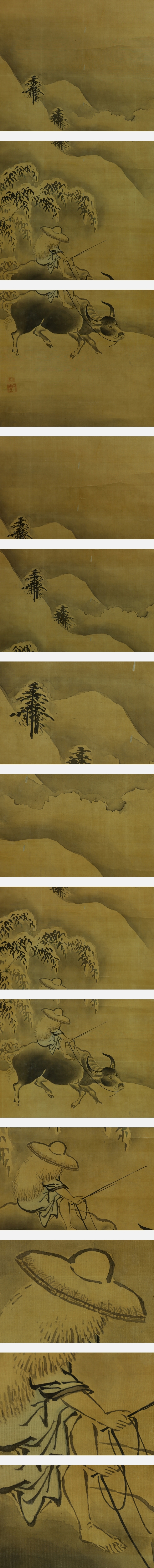 桑原幽宅 (?-1707) 名は守澄、通称は權兵衛。岩国の醤家桑原玄佐の二男。 画を斎藤等室に学び、李仙と号した。 寛文6年江戸に遊び、狩野探幽の門に入り、 画技を認められ幽宅の号を許された。 延宝3年に探幽が命を受け新造内裏に画を描いた際に手伝い、法橋に叙された。 帰郷後、岩国で一家をなした。宝永4年死去した。 本紙は、染み、汚れ、強い折れ、皺、虫食い、ヤケ、修理痕があります。 表装は、染み、汚れ、強い折れ、皺、虫食い、破れ、ほつれ、剥れ、修理痕、くすみ、擦れ、 軸先に汚れとヒビ、箱に傷み、割れがあります。 【サイズ】 作品 横約47cm×縦約113cm 表装 横約59cm×縦約201cm |