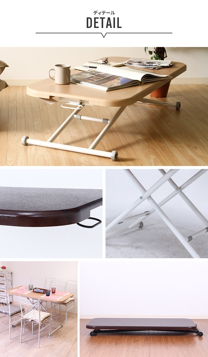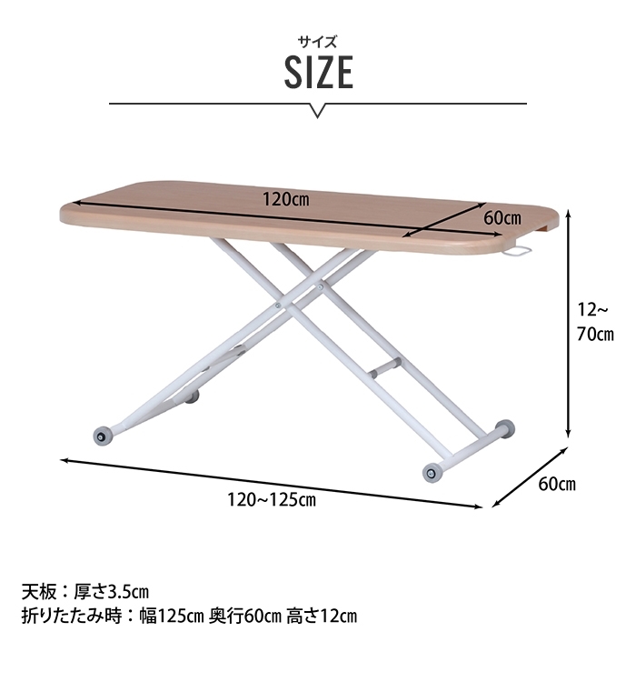 [全体]約幅120~125×奥行60×高さ12~70cm [天板厚み]約3.5cm [天板サイズ]約幅120×奥行60×高さ3.5cm 折りたたみサイズ:1250x600x120mm |