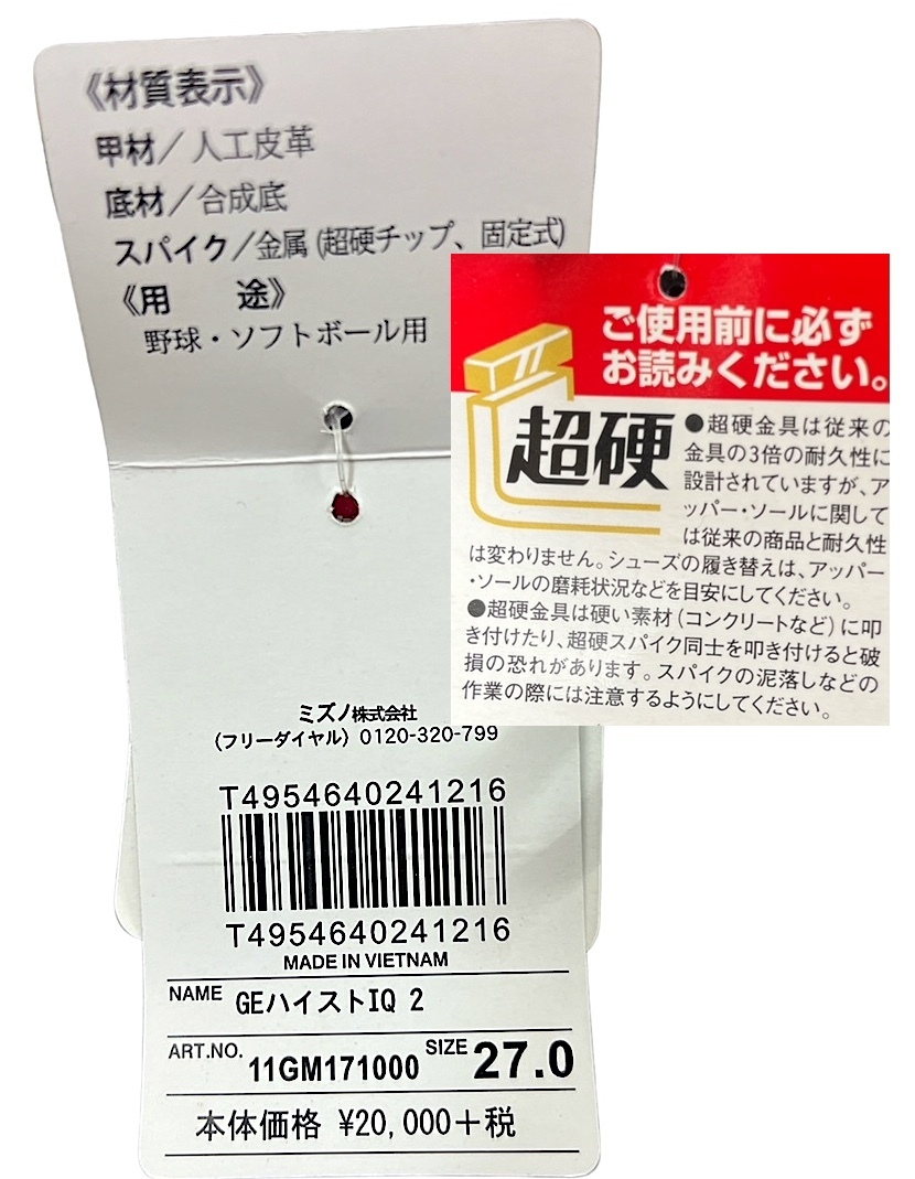■展示品処分!★新品タグ付 MIZUNO ミズノ スパイク★GEハイスト IQ2 超硬★11GM171000★黒 27cm★野球 ¥22000
