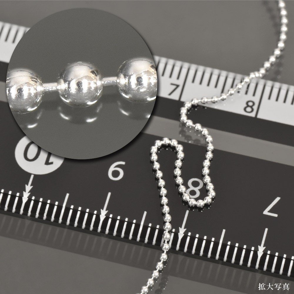 ボールチェーンとはその名の通りボールが連なったデザインのチェーンです。 丸くコロコロとしたデザインは鎖特有の重々しい感じを払拭し、ポップなテイストやカジュアルなシーンに良く合います。ユニセックスなデザインなので女性、男性問わず1本持っておくと便利な定番のチェーンです。 また、ボールチェーンは構造上絡まりにくく、万が一絡まった場合でも解きやすいという性質があります。 |