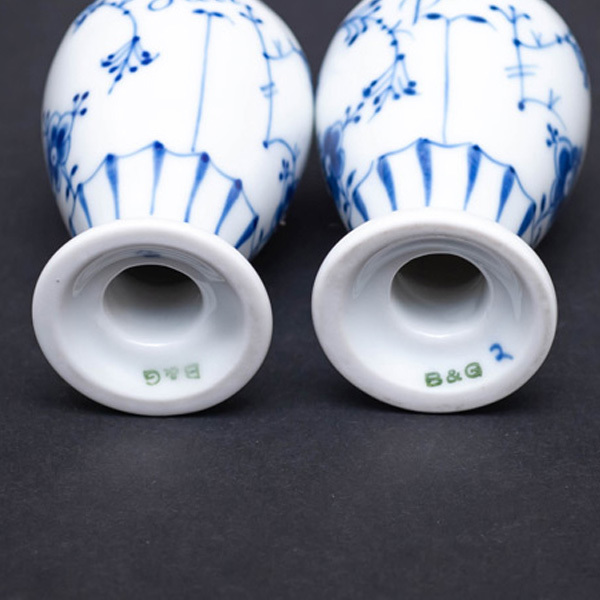 ビング・オー・グレンダールのブルートラディショナルのソルト&ペッパー。 白磁にブルーのラインとキクの花が一輪描かれただけのシンプルな一品。このブルートラディショナルは、ロイヤル・コペンハーゲンの人気柄ブルーフルーテッドとルーツを同じくする伝統的なパターンです。残念ながら2本ともコルク栓がありません。 ■サイズ 直径40 × 高さ73mm(穴径13mm) ■付属品 なし ■状態 B(良品):美品ですが、2本ともコルク栓がありません。 |