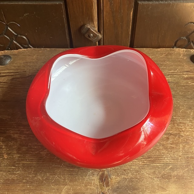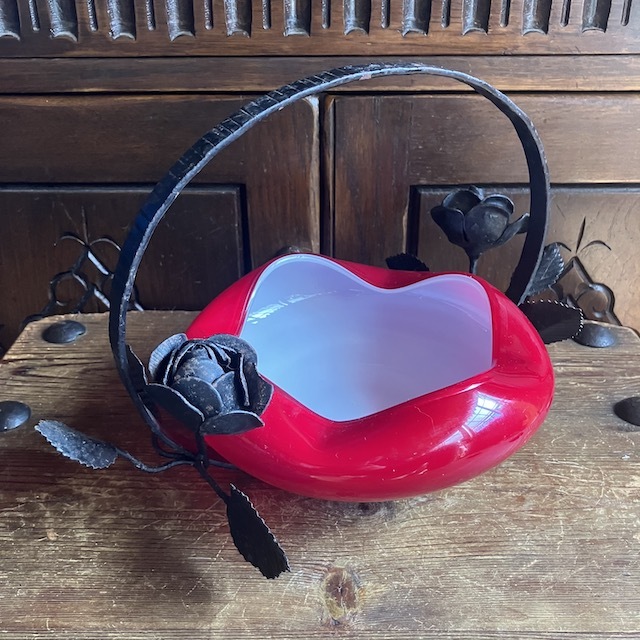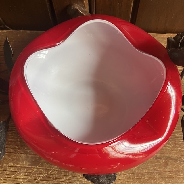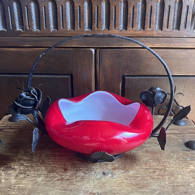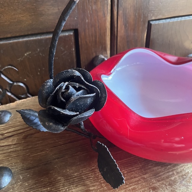 アイアン部分はバラをモチーフにデザインされており、ガラスの器はホワイトのガラスにレッドのガラスが被さった入り口部分が波打ったデザイン
