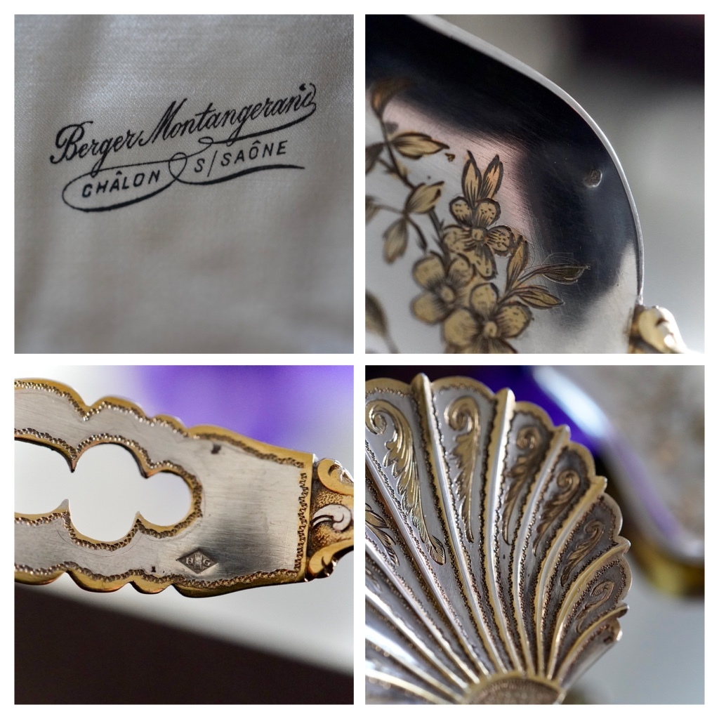 フルーツなどをサーブするため、繊細な細工部分や裏側などには黒ずみを防ぐ目的でスターリングシルバー=純銀の上からヴェルメイユ(金メッキ)されていてとにかく豪華で美しいです。
