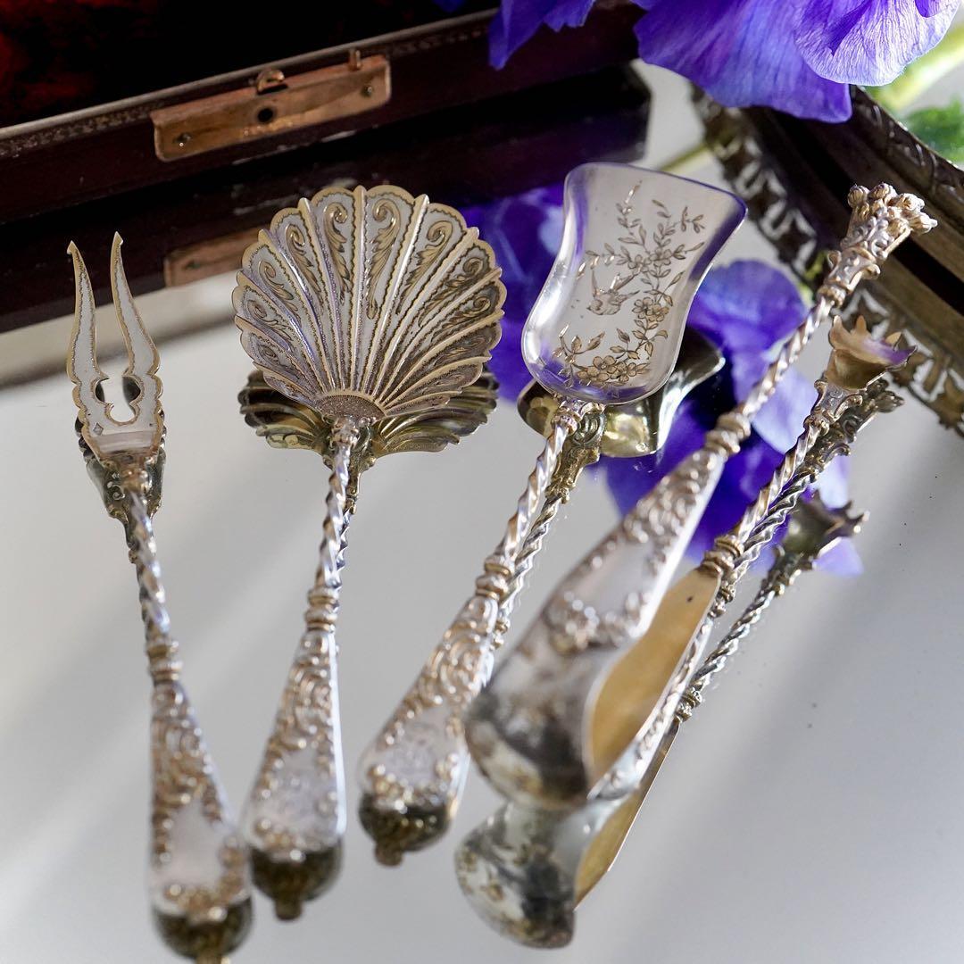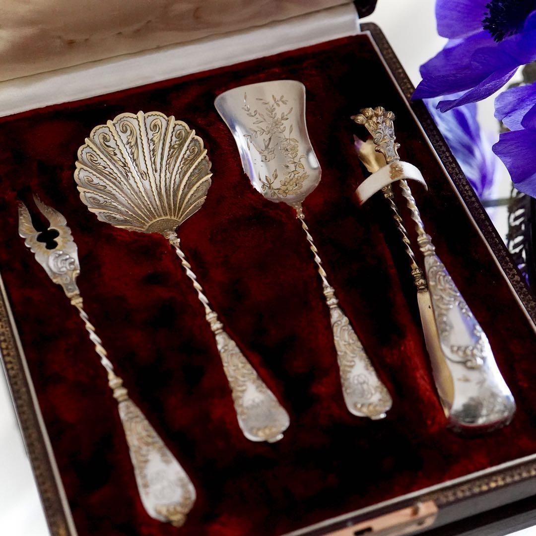 繊細な細工がとても美しいデザート用シルバーサービングセットを出品致します。