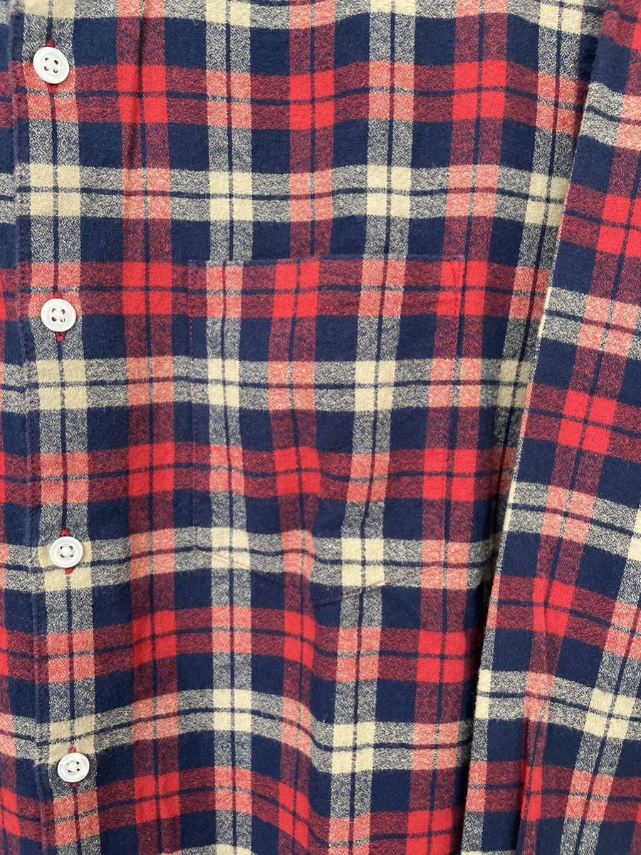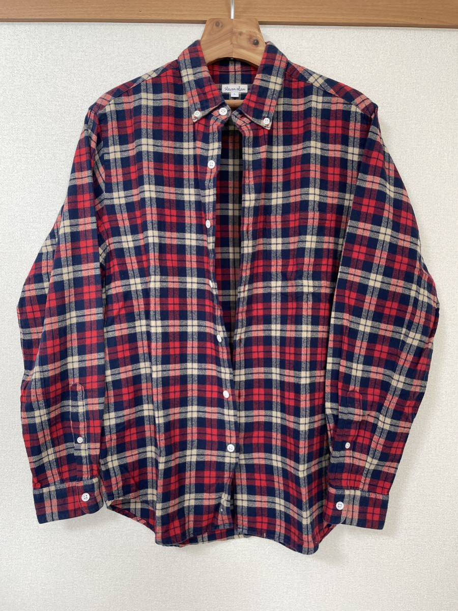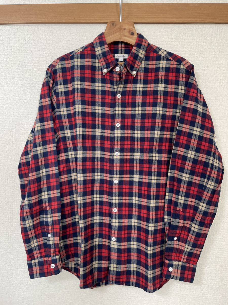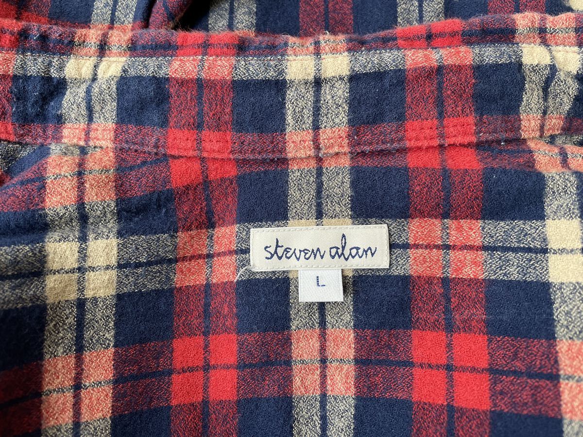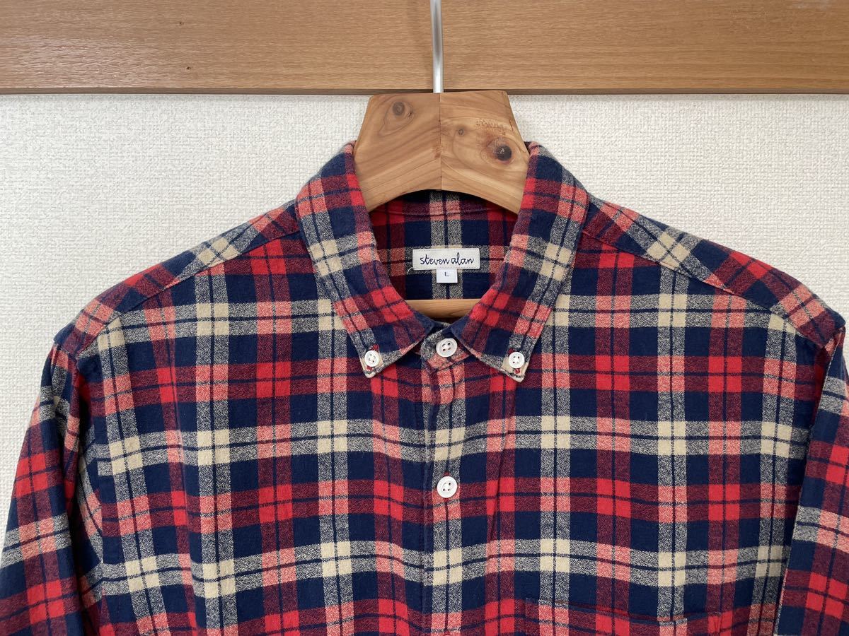 スティーブンアランのコットンボタンダウンチェックシャツです。汚れやダメージの無い、美中古品です。サイズはLで、おおよその寸法が 肩幅44 身幅55 着丈73 肩からの袖丈61 といったところです。落ち着いた色味のチェックシャツです。少し薄手で軽めのコットンフランネル素材をしています。使い勝手の良い一枚だと思います。お好きな方、この機会にいかがでしょうか?よろしくお願いいたします。