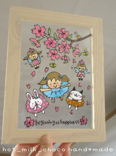 ★NO.L46★ステンドグラス風・2Lサイズ・桜・花・春・女の子・猫・妖精・ハンドメイド・雑貨・イラスト・インテリア・飾り・アート・絵