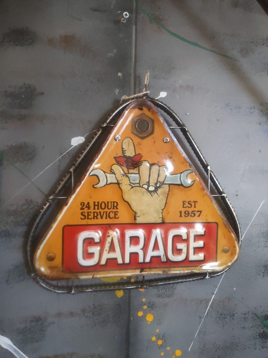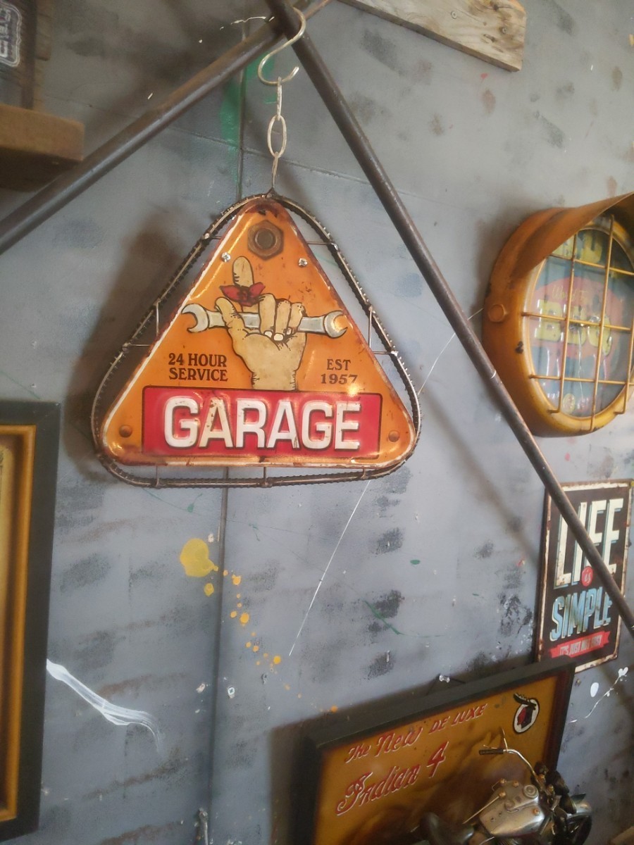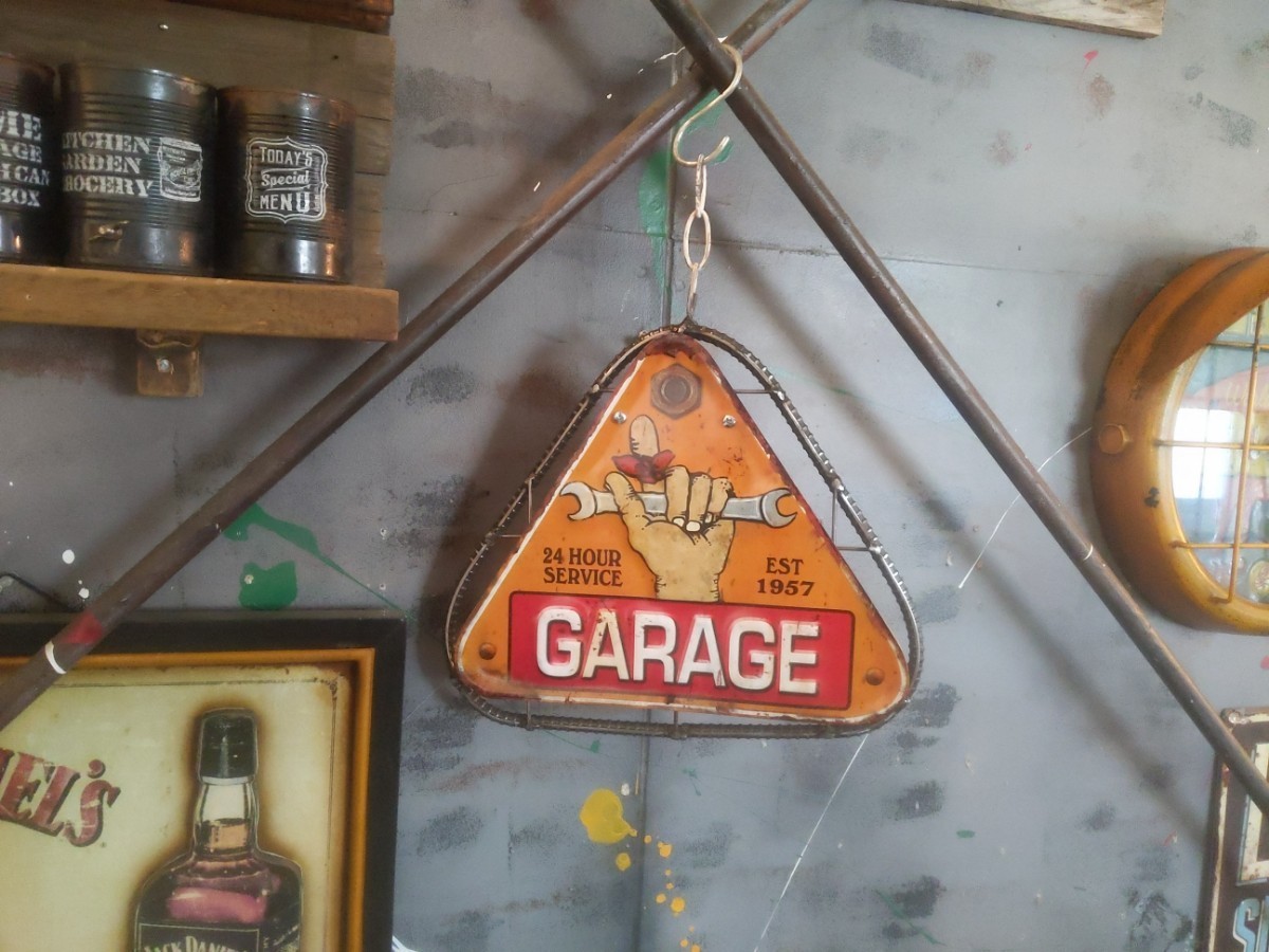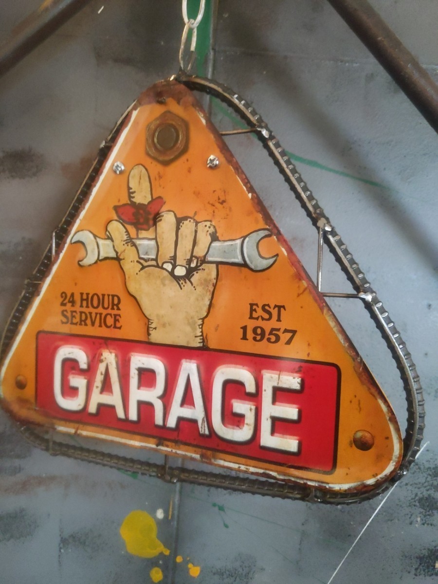 エンボス(凸凹)加工されたヴィンテージデザインのブリキ看板を、鉄筋と溶接金網で枠組みしデザインしたガレージ看板です。