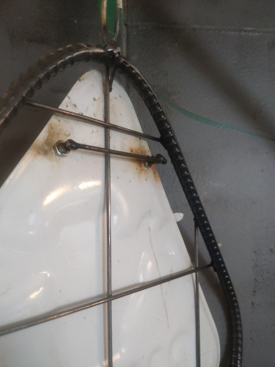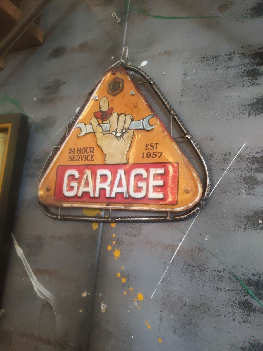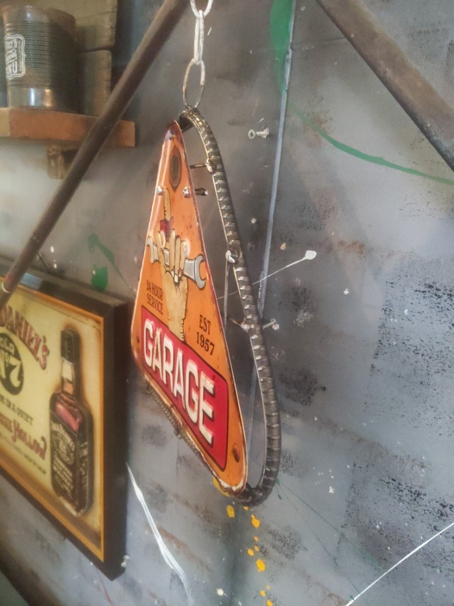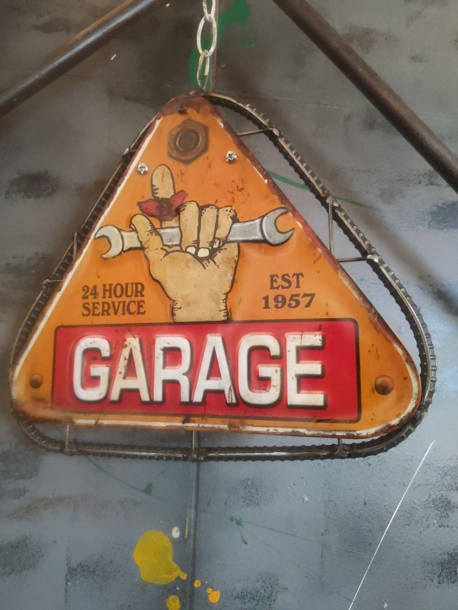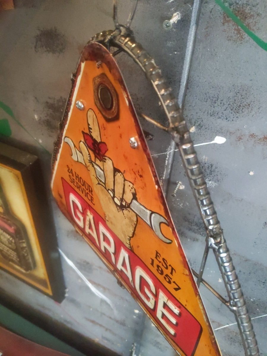 エンボス(凸凹)加工されたヴィンテージデザインのブリキ看板を、鉄筋と溶接金網で枠組みしデザインしたガレージ看板です。