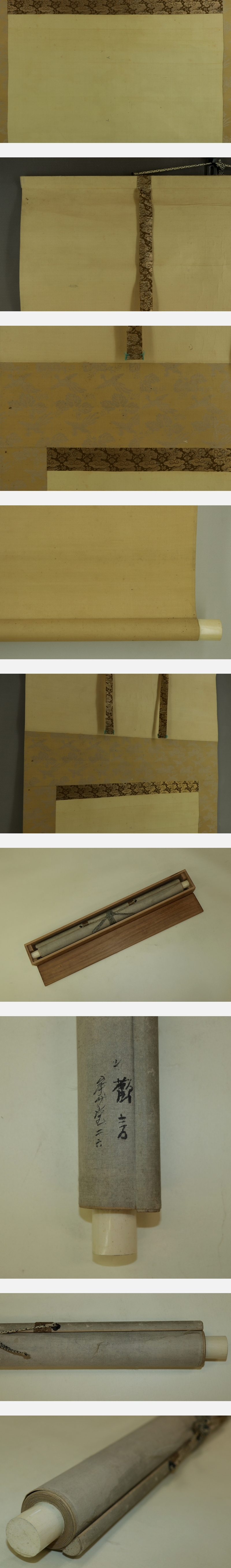 岸竹堂 きし-ちくどう (1826-1897) 江戸後期-明治時代の日本画家。 文政9年4月22日生まれ。狩野永岳や岸連山に学び,岸家の養子となる。 鳥獣画,特に虎を得意とし,維新後は風景画に洋画の写実的技法も取り入れた。 帝室技芸員。明治30年7月27日死去。72歳。 近江(滋賀県)出身。本姓は寺居。名は昌禄。 本紙は、染み、汚れ、強い折れ、皺、虫食い、ヤケがあります。 表装は、染み、汚れ、折れ、皺、虫食い、破れ、ほつれがあります。 【サイズ】 作品 横約41.5cm×縦約114cm 表装 横約55.5cm×縦約197cm |