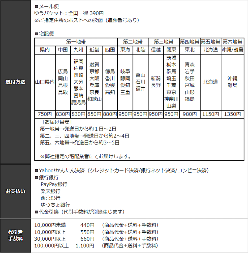 | 商品発送 | 入金確認後、当日~翌営業日以内に発送します。 |