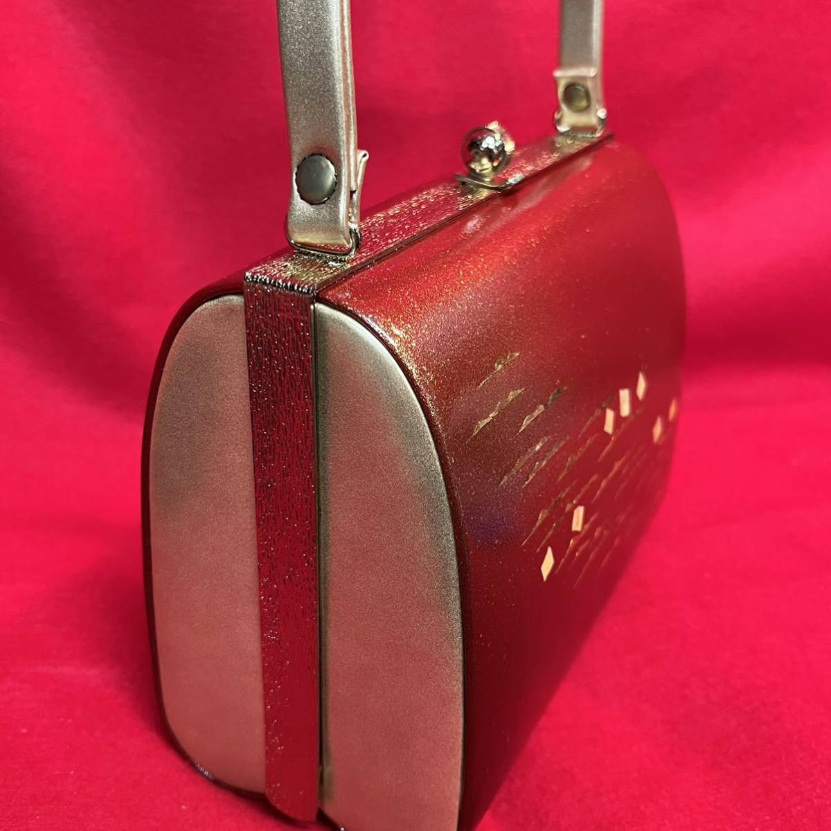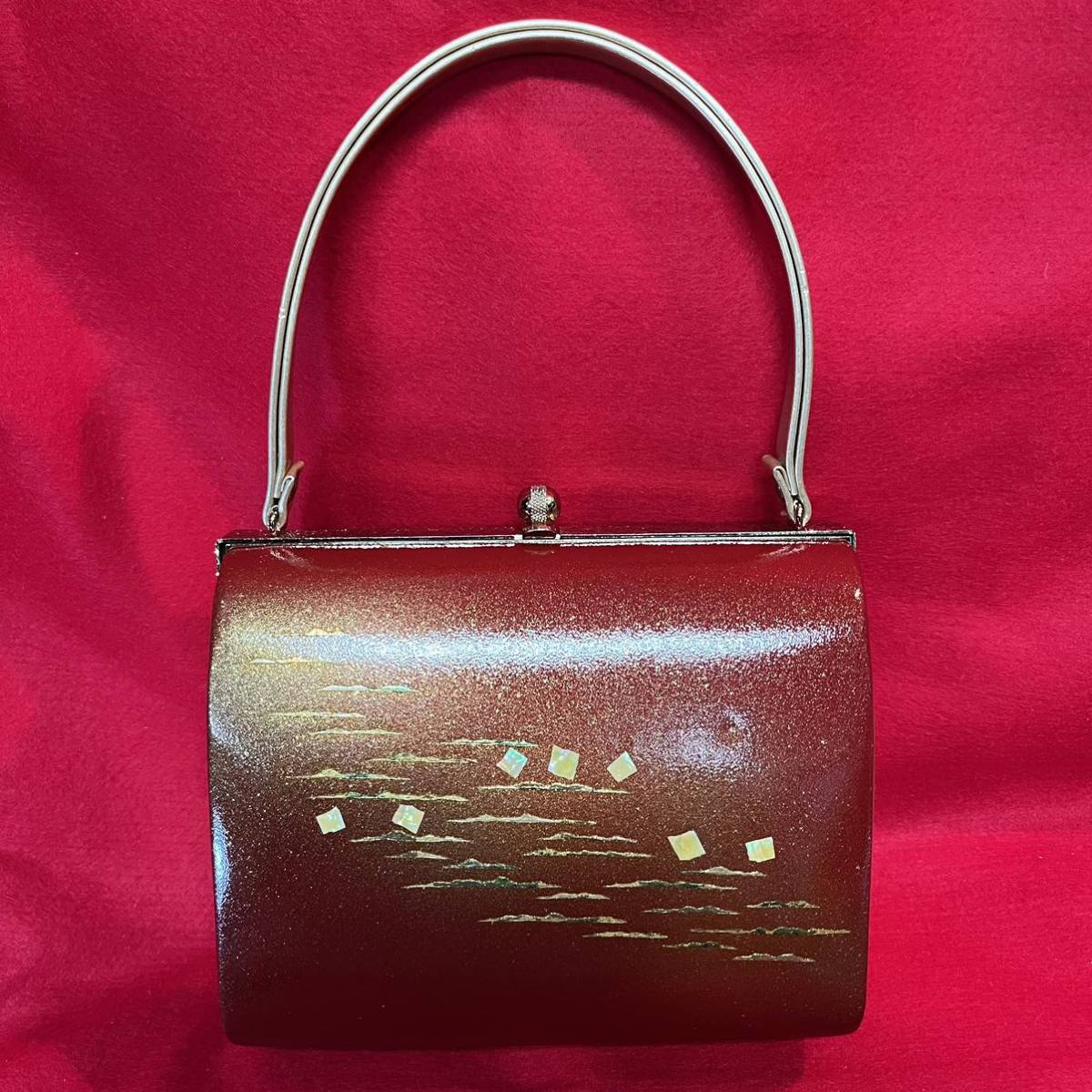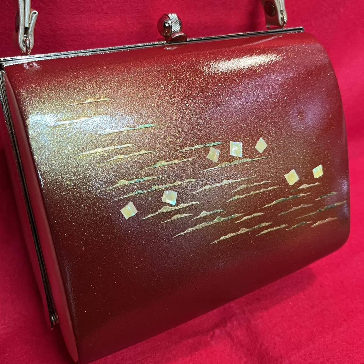 ☆美品☆ 和装バッグ 赤丹 金彩 螺鈿 霞雲紋様 金留め具 フォーマル 結婚式 振袖 トートバッグ 和装小物 (02036並