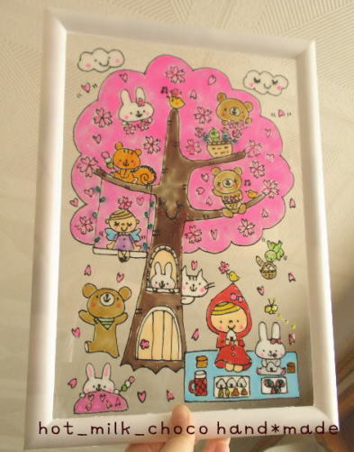 ★NO.A54★ステンドグラス風・A4サイズ・春・桜・お花見・お弁当・花吹雪・イラスト・女の子・動物・飾り・インテリア・雑貨・ハンドメイド