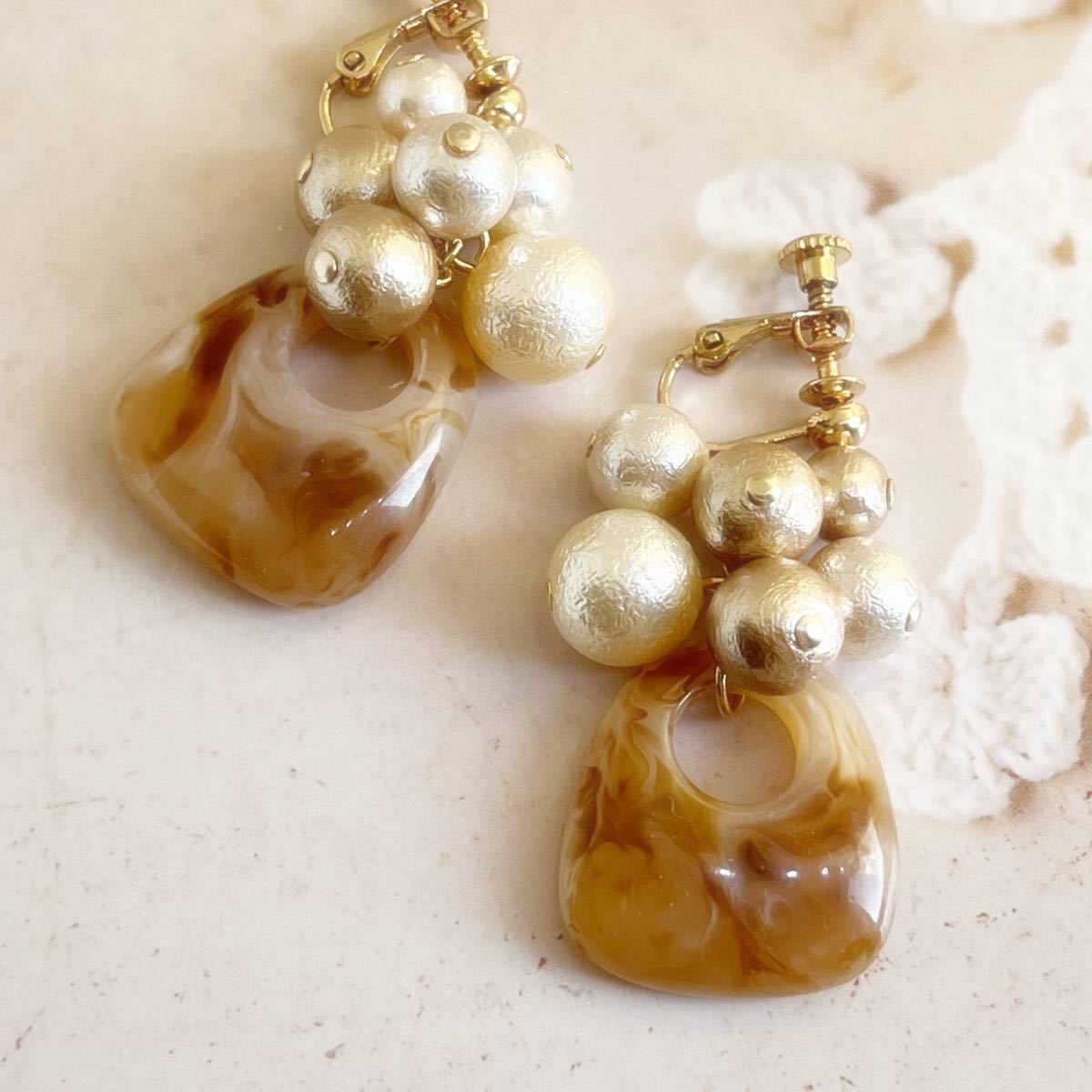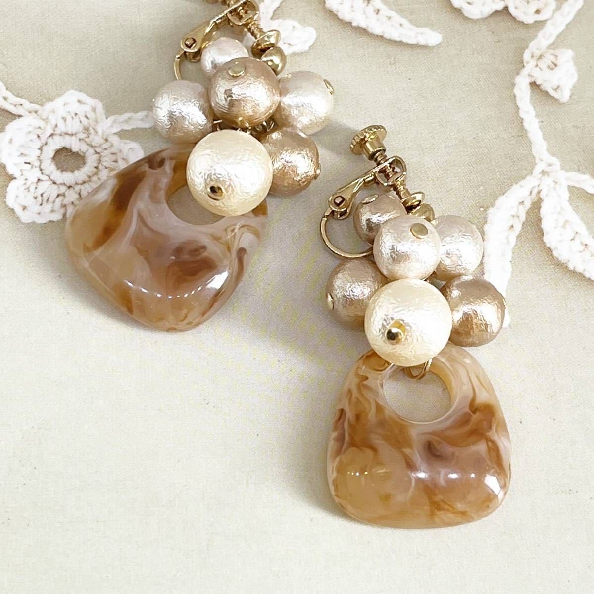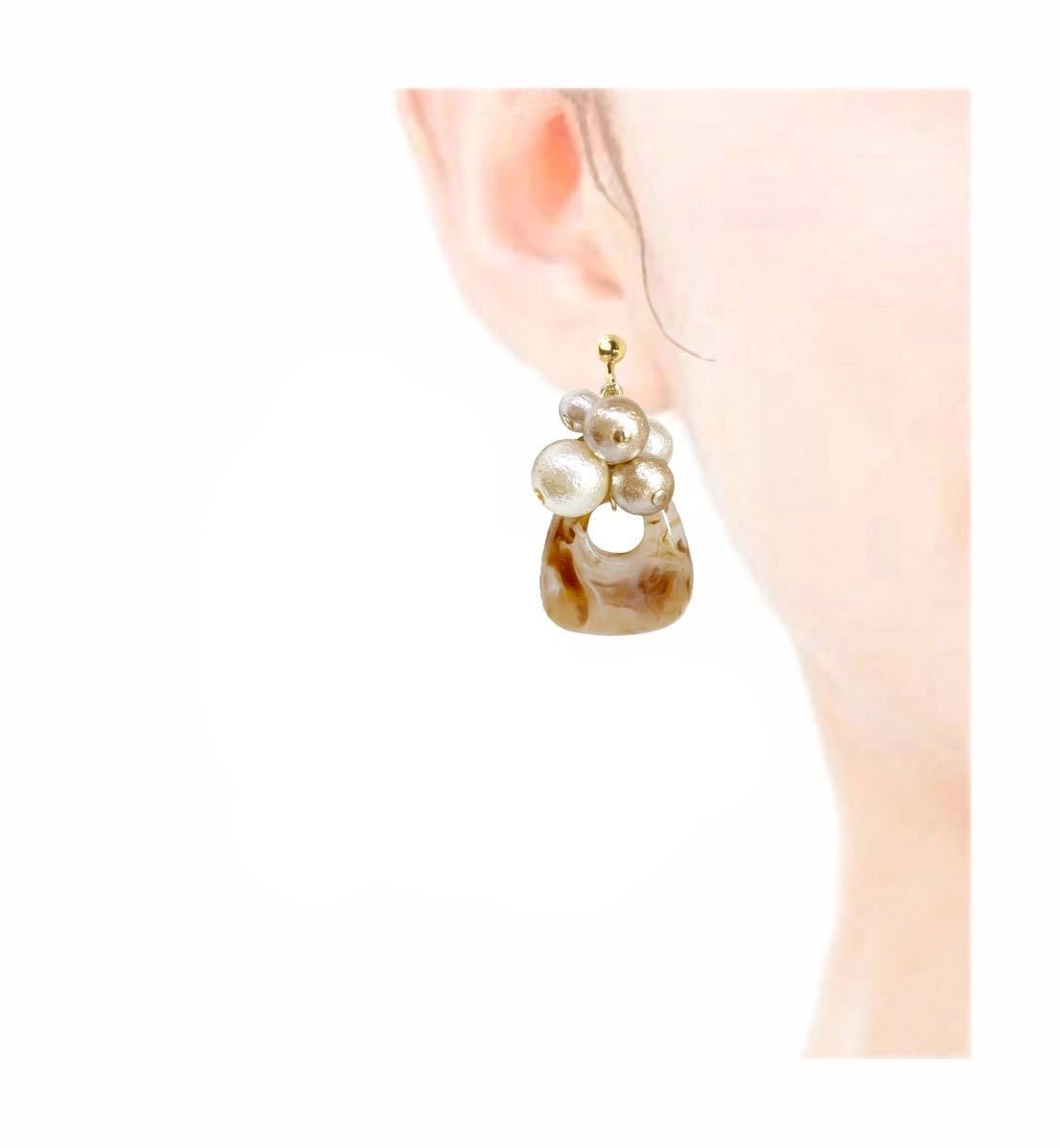 金具変更可*ブラウン系アクリル&パール・イヤリング