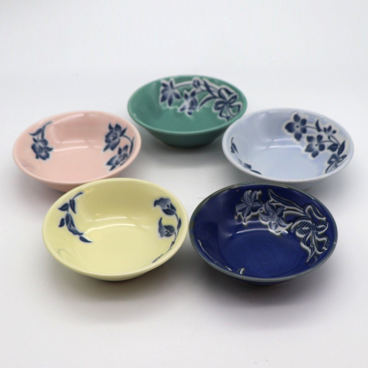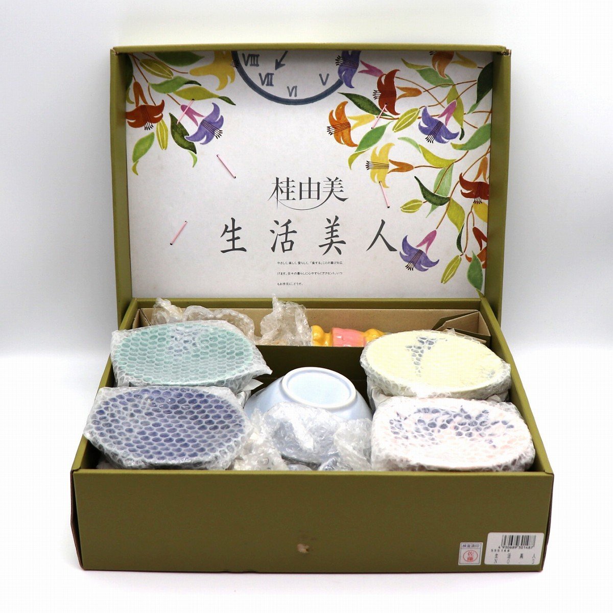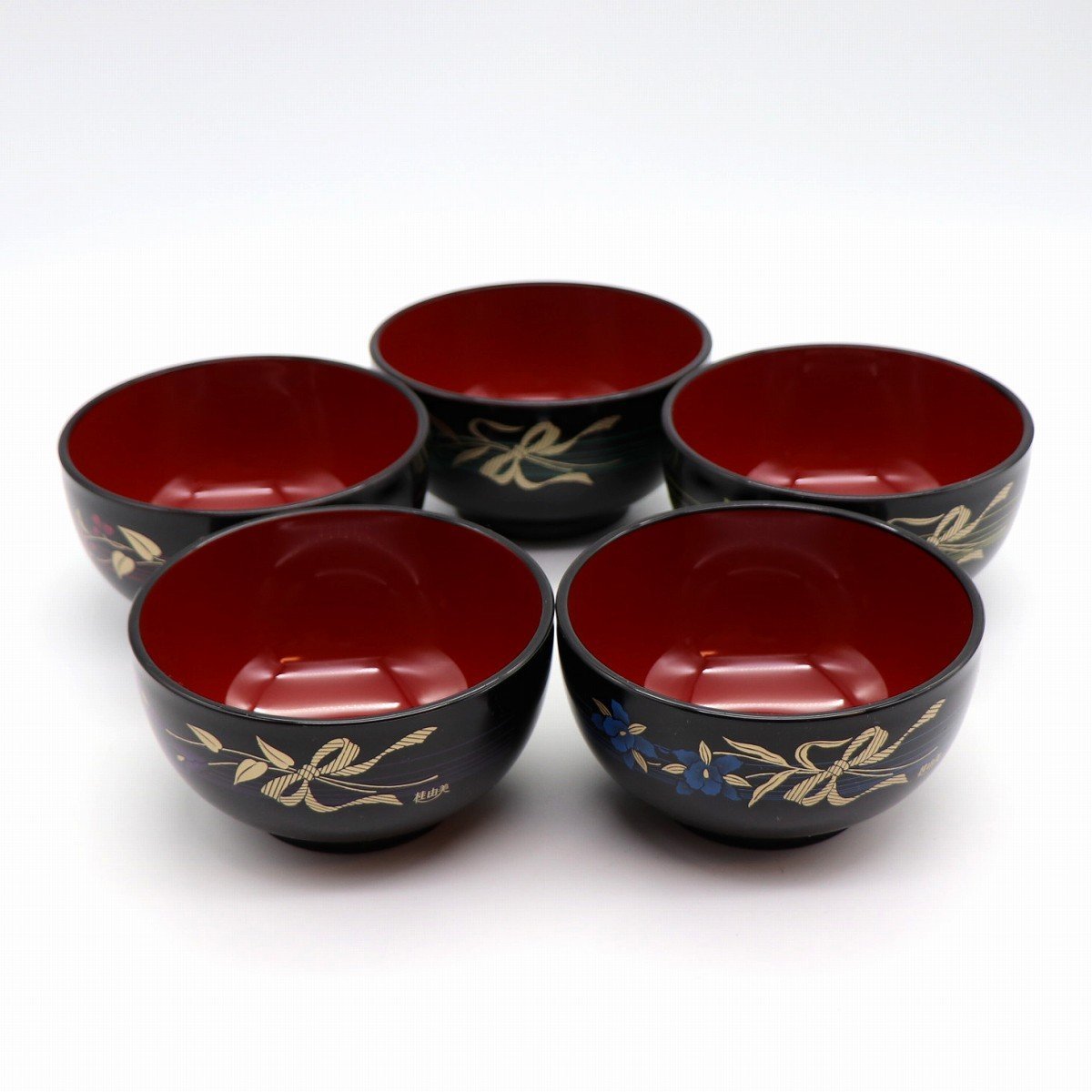 小鉢5個(直径:約115㎜、高さ:約36㎜)、お椀5個(直径:約112㎜、高さ:約60㎜)、調味料入れ2個(幅:約60×55㎜、高さ:約123㎜)、箸置き5個(幅:約41×37㎜、高さ:約19㎜)、状態ランク:A