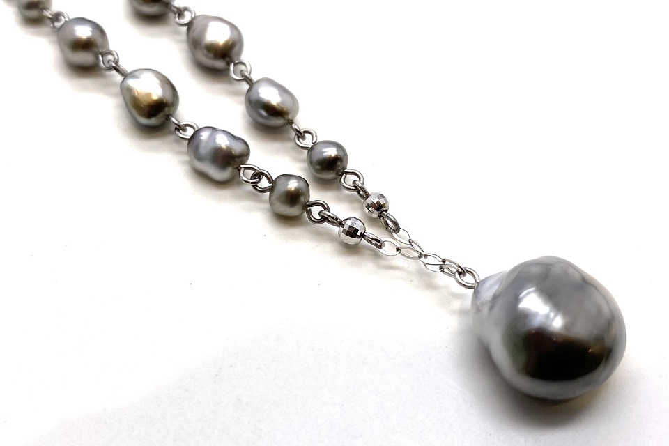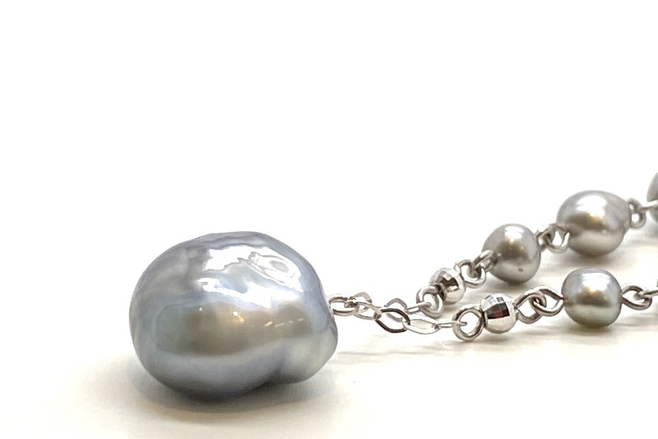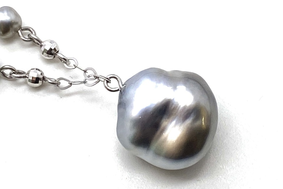 解説 | 黒蝶貝に偶発的に、入り込んだ小さな砂粒に真珠層が厚く巻いた奇跡の造形。ミステリアスな海中の物語を胸元に! |