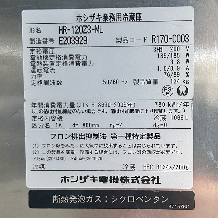 ホシザキ タテ型冷蔵庫 HR-120Z3-ML 三相200V 2015年製 中古 業務用 冷蔵庫