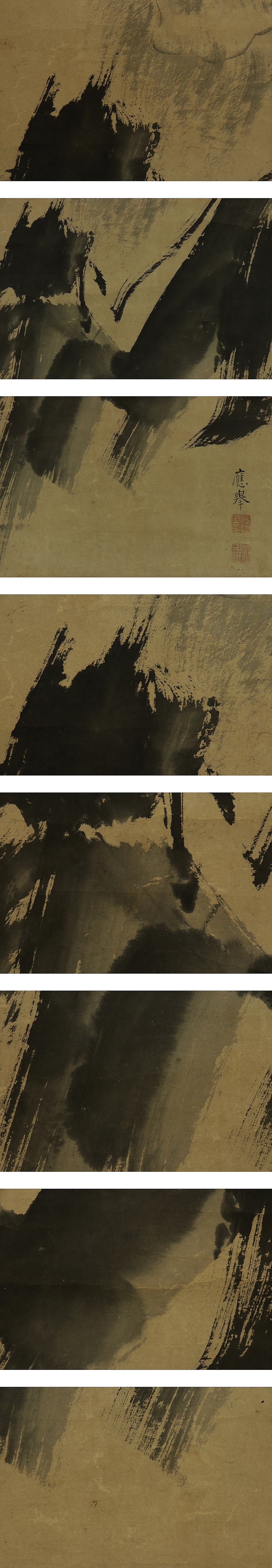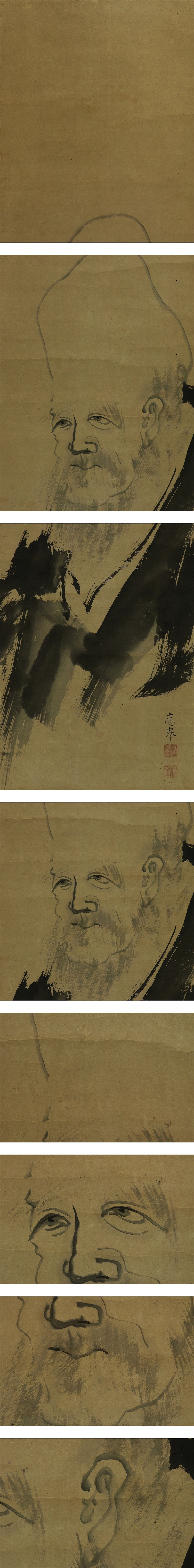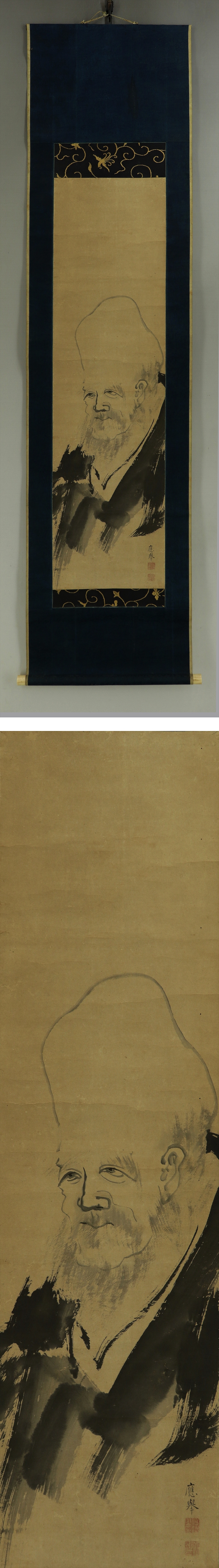 円山応挙 まるやま-おうきょ(1733-1795) 江戸後期の画家。円山派の祖。丹波生。 字は僊斎・仲選、号は一嘯・夏雲・仙嶺等、通称は主水。 石田幽汀に狩野派の画法を学び、幽汀の写生的画法に、 宋・元画の技法を取り入れると共に、西洋画の遠近法を研究して一家を成した。 動植物の写生を最も能くする。 寛政7年(1795)歿、63才。 本紙は、染み、汚れ、強い折れ、皺、虫食、ヤケ、擦れがあります。 表装は、染み、汚れ、折れ、皺、虫食、破れ、ほつれ、軸先に汚れと傷みがあります。 【サイズ】 作品 横約28.5cm×縦約107.5cm 表装 横約42cm×縦約172cm |