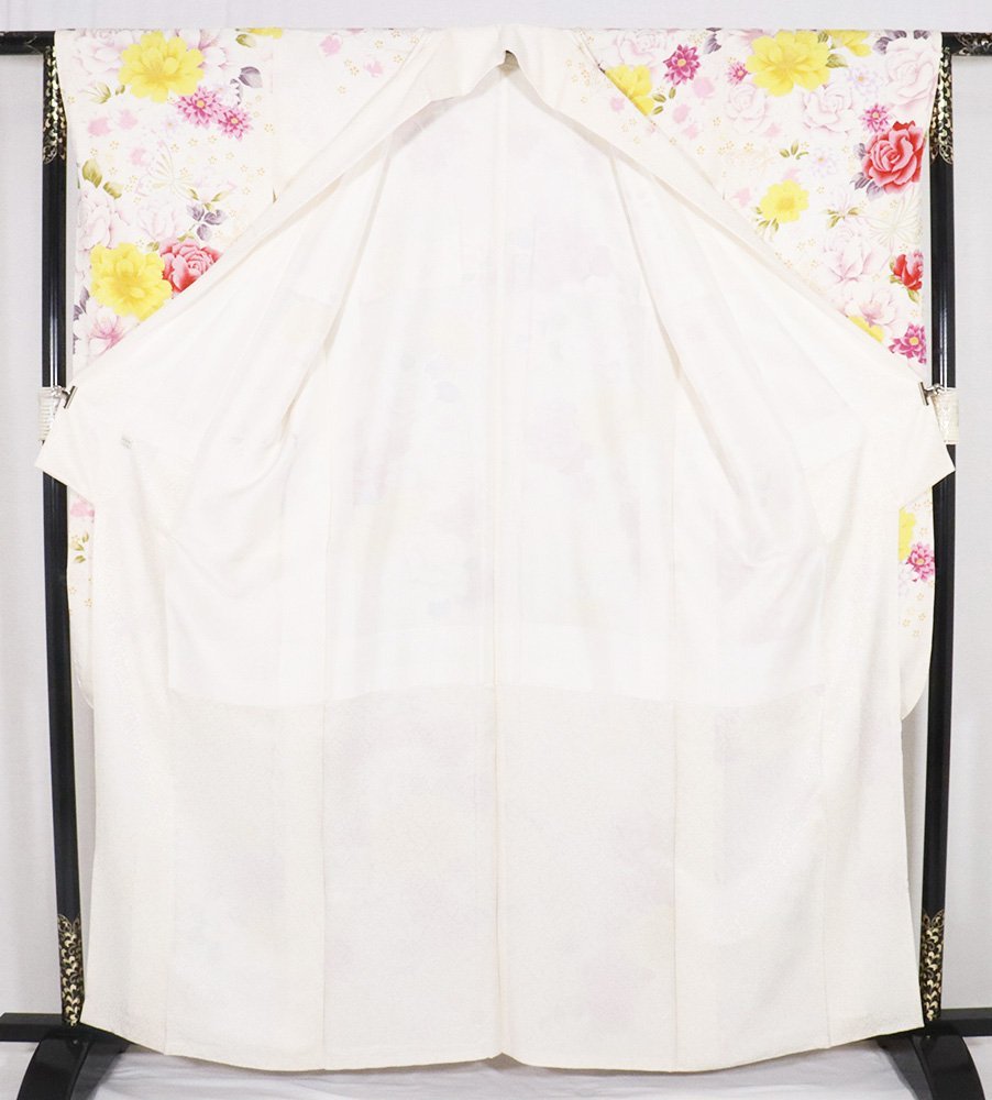 | 本振袖 袷 丹後縮緬地 白地 刺繍牡丹 薔薇・桜・蝶 169 広襟 新品 仕付け付き 日本製 | |