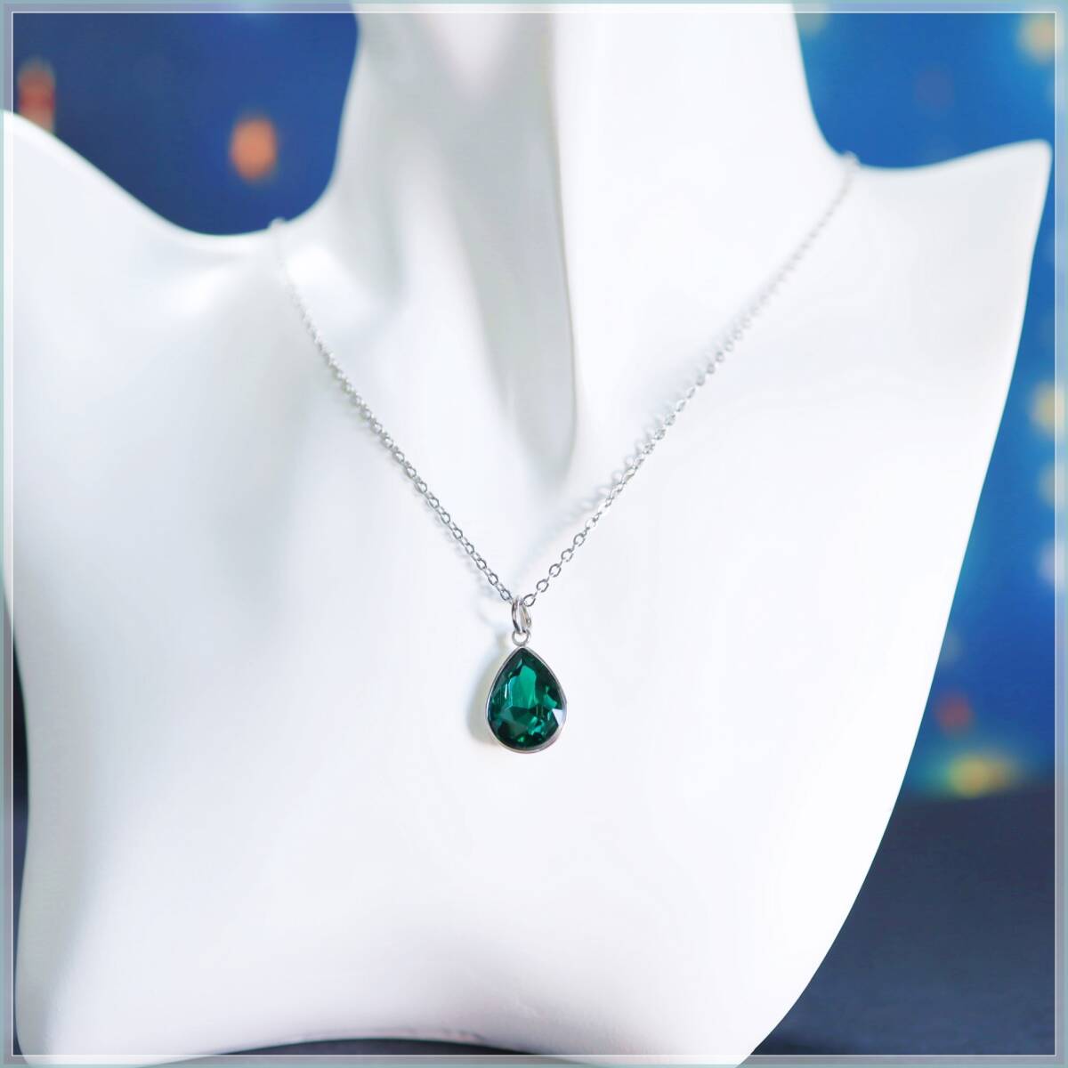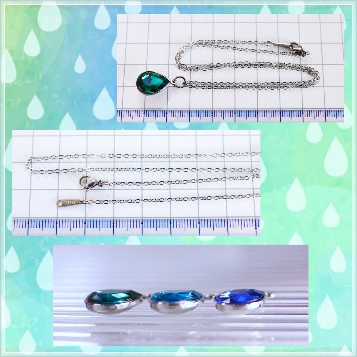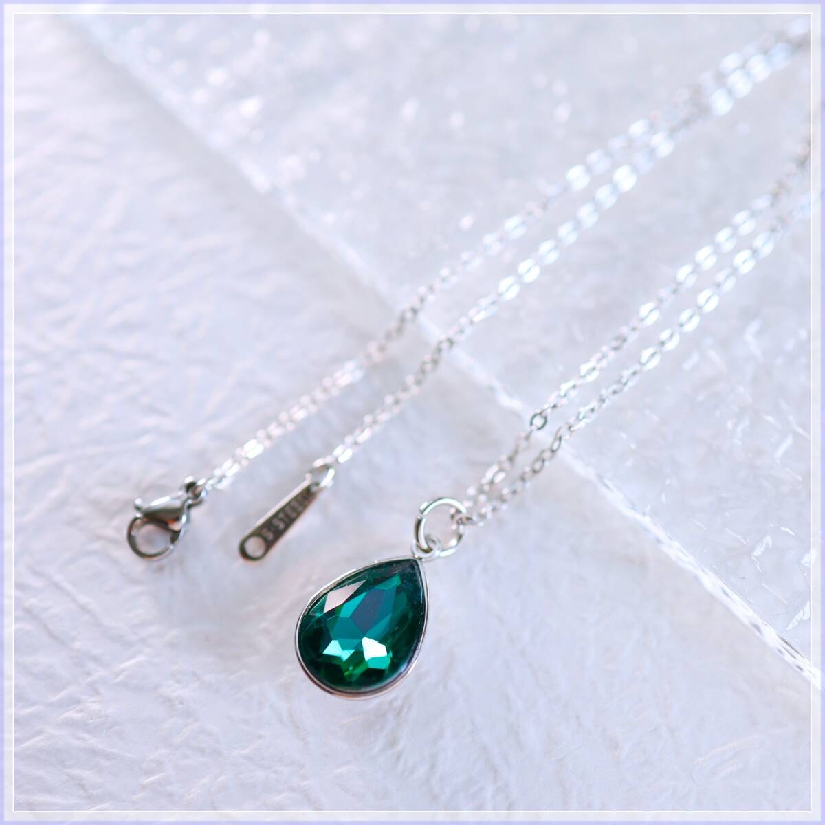 N7942/オールステンレス エメラルドグリーンカラー 緑色 雫 硝子のしずくネックレス ステンレス製 ドロップペンダント 風水 メンバーカラー