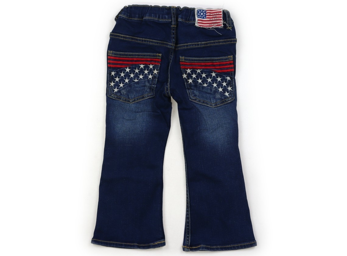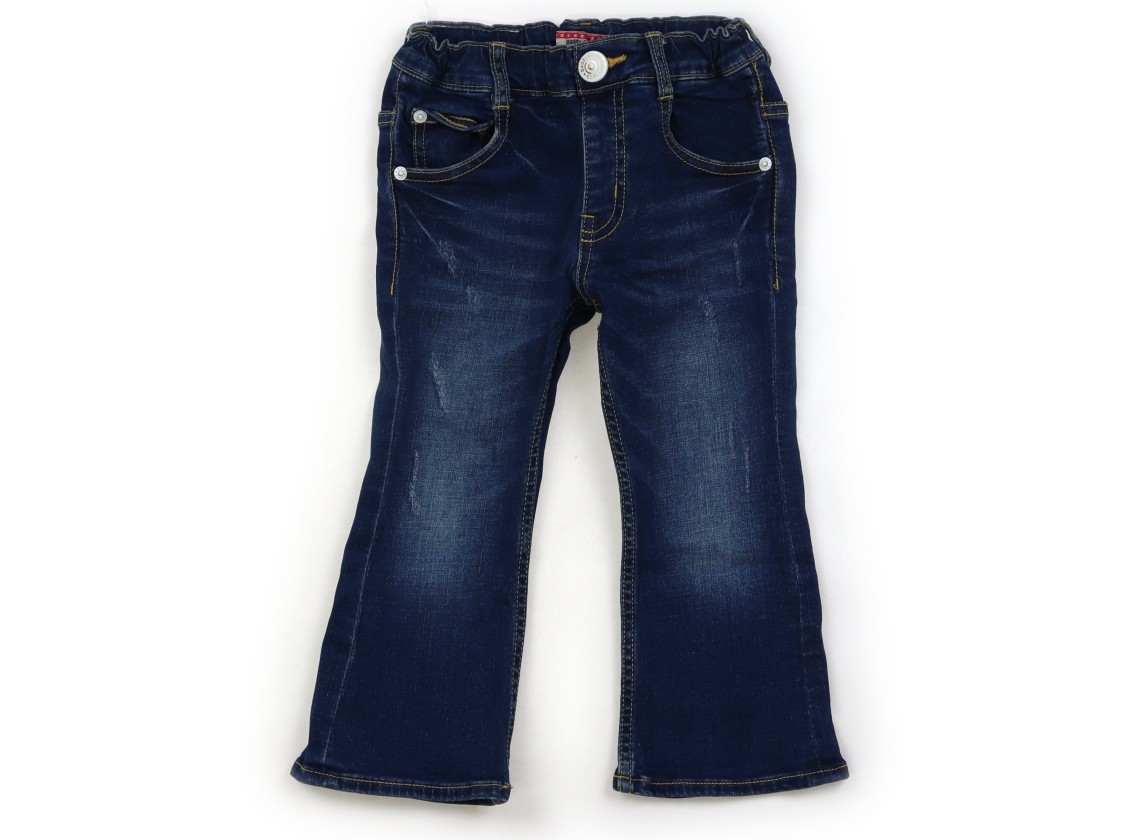 綿・ポリウレタンのストレッチデニムで、ウエストは総ゴムです。全体にデニム特有の色褪せがあり、元々のデザインか不明ですが、両ももとお尻ポケットにダメージ加工のようなスレ傷があります。まだまだ普段着として活躍してくれそうです。