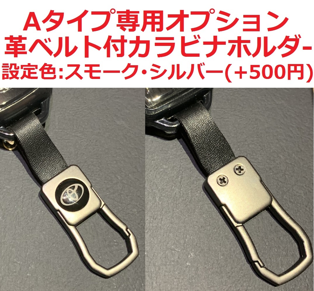 また、Aタイプに限り専用革ベルト付カラビナホルダーをオプションで追加出来ます(+500円・カラビナ色シルバーorスモーク)