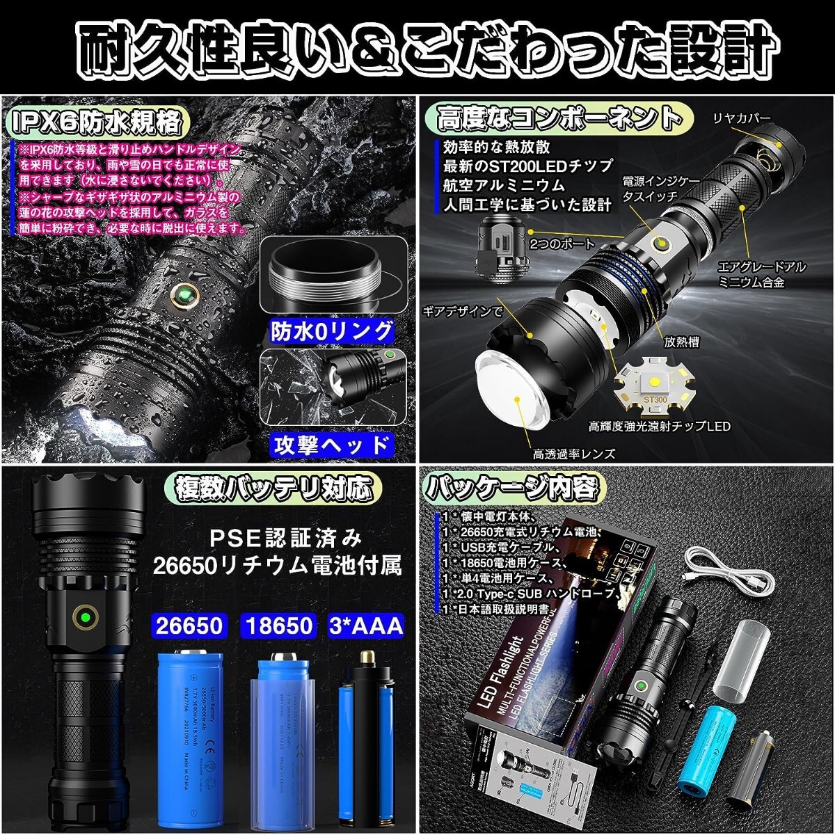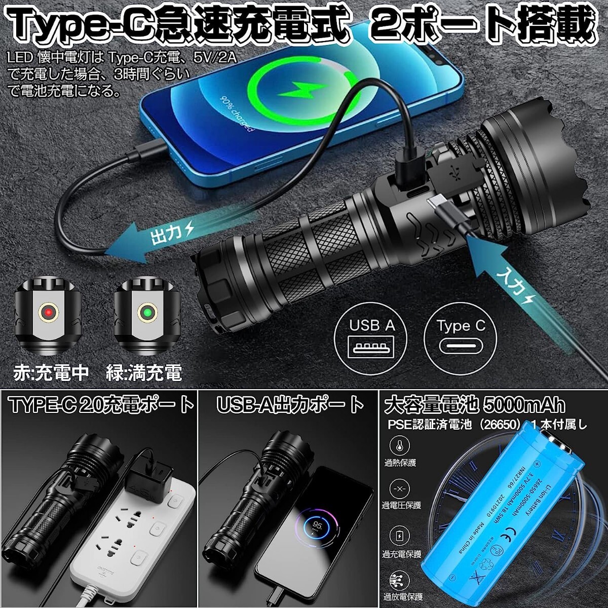 最新誤点灯防止強化版 】懐中電灯 led 強力 軍用ライト 最強 ハンドライト 高輝度 遠射 Type-C USB急速充電 電池式 明るい 新型 フラッシュライト 長時間使用 手持ち 携帯 ズーム5モード調光 耐衝撃 IPX6防水 防災 停電対策 などのシーンに適です さらに 登山 キャンプ
