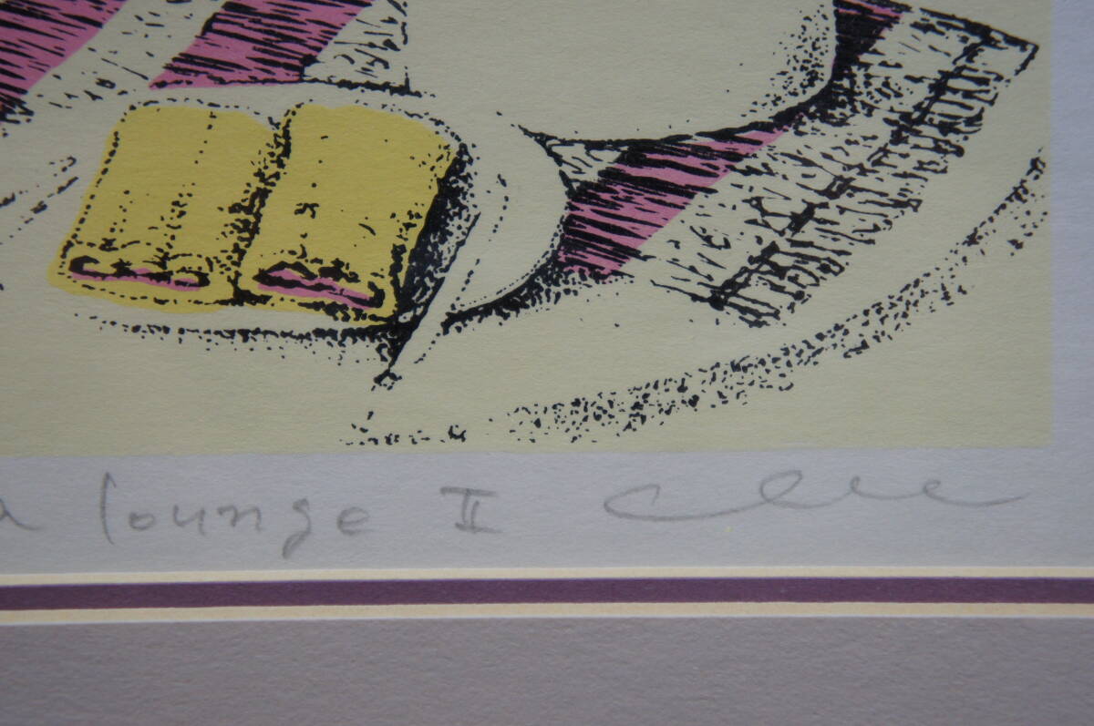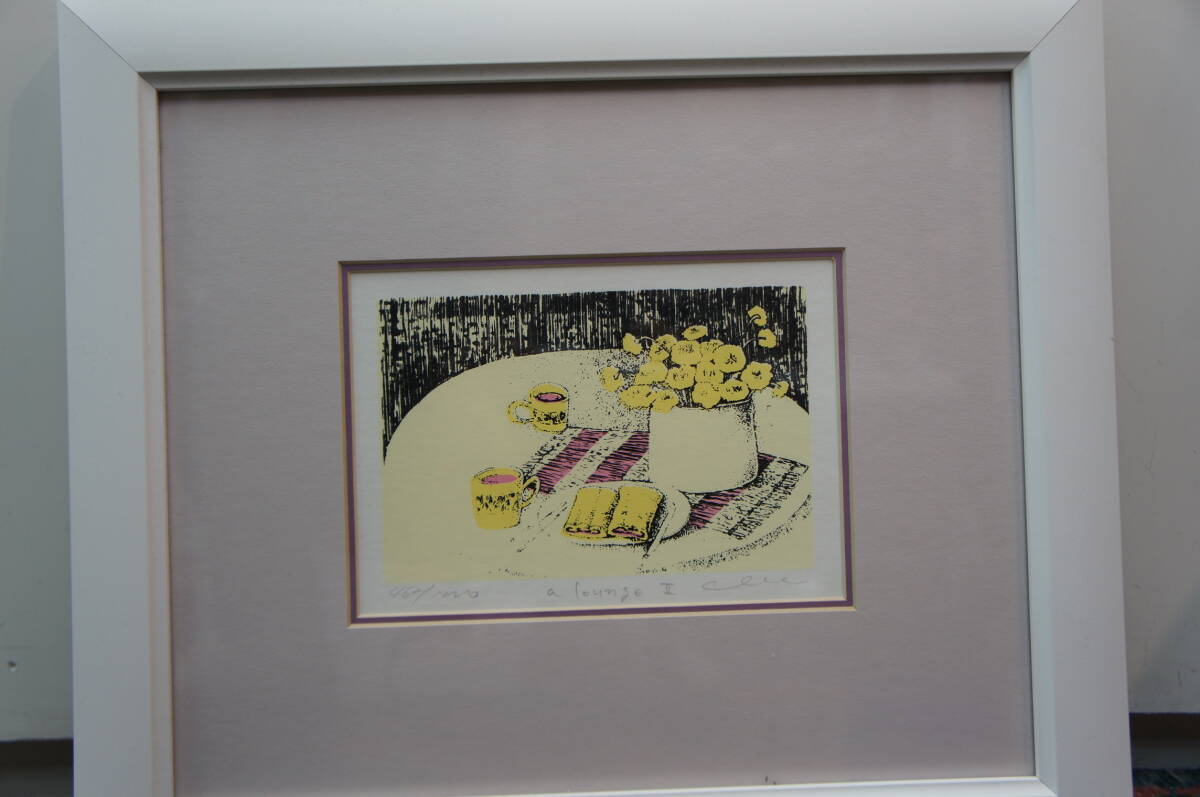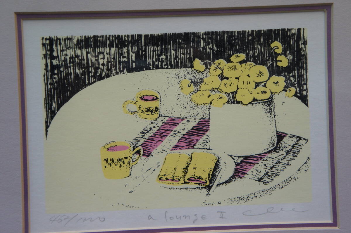 リトグラフ★テーブルの上のコーヒーカップと花★マリーゴールド