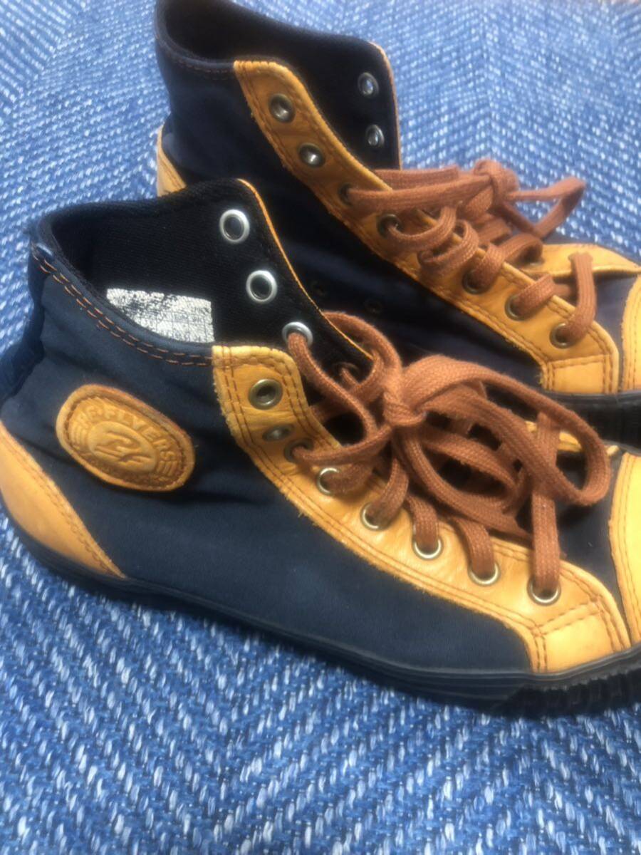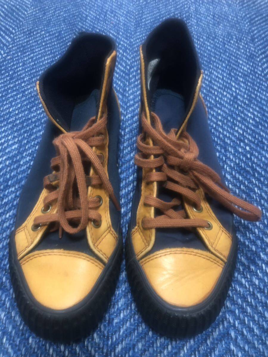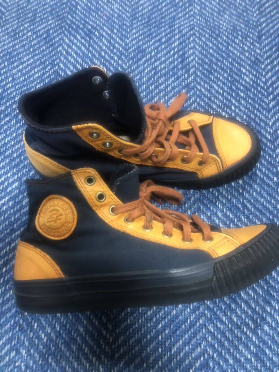 PFフライヤーズのハイカットスニーカーです。生地が紺色×レザーです。配色も良く合わせやすいスニーカーです。表記サイズは24cmです、即着用して頂けます。入札後のキャンセル、苦情、返品はなしでお願いします。発送は、ゆうパック着払いにて対応させて頂きます。