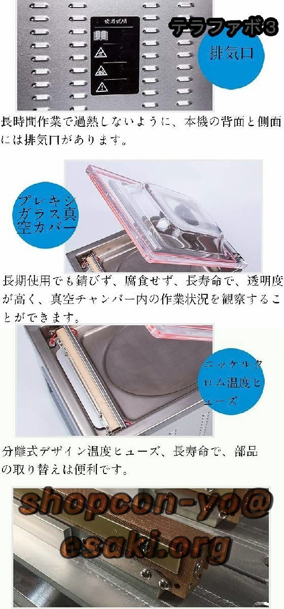 【熱放散】:速い熱放散、長時間作業で過熱しないように、真空シール機の背面と側面には排気口があります。分離式デザインニッケルクロム温度ヒューズ長寿命で、部品の取り替えは便利です。