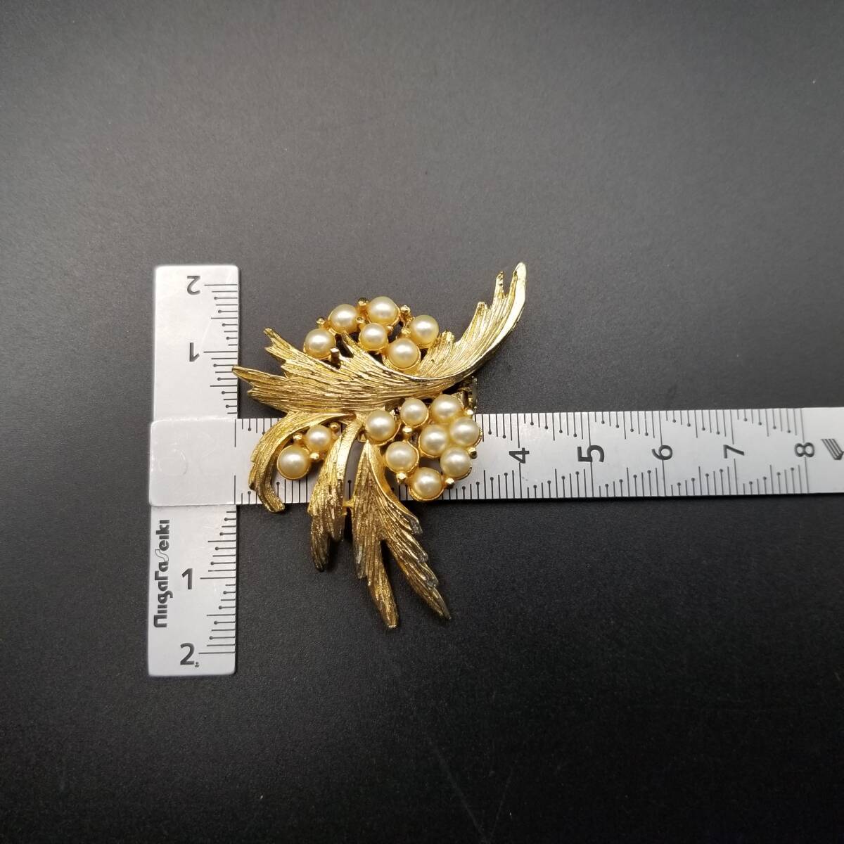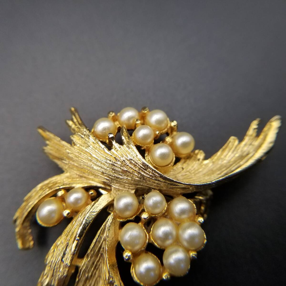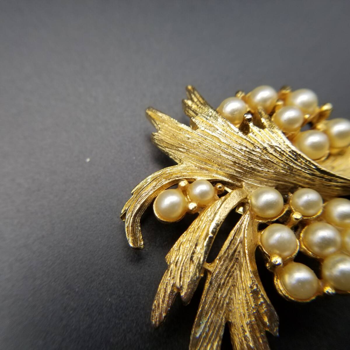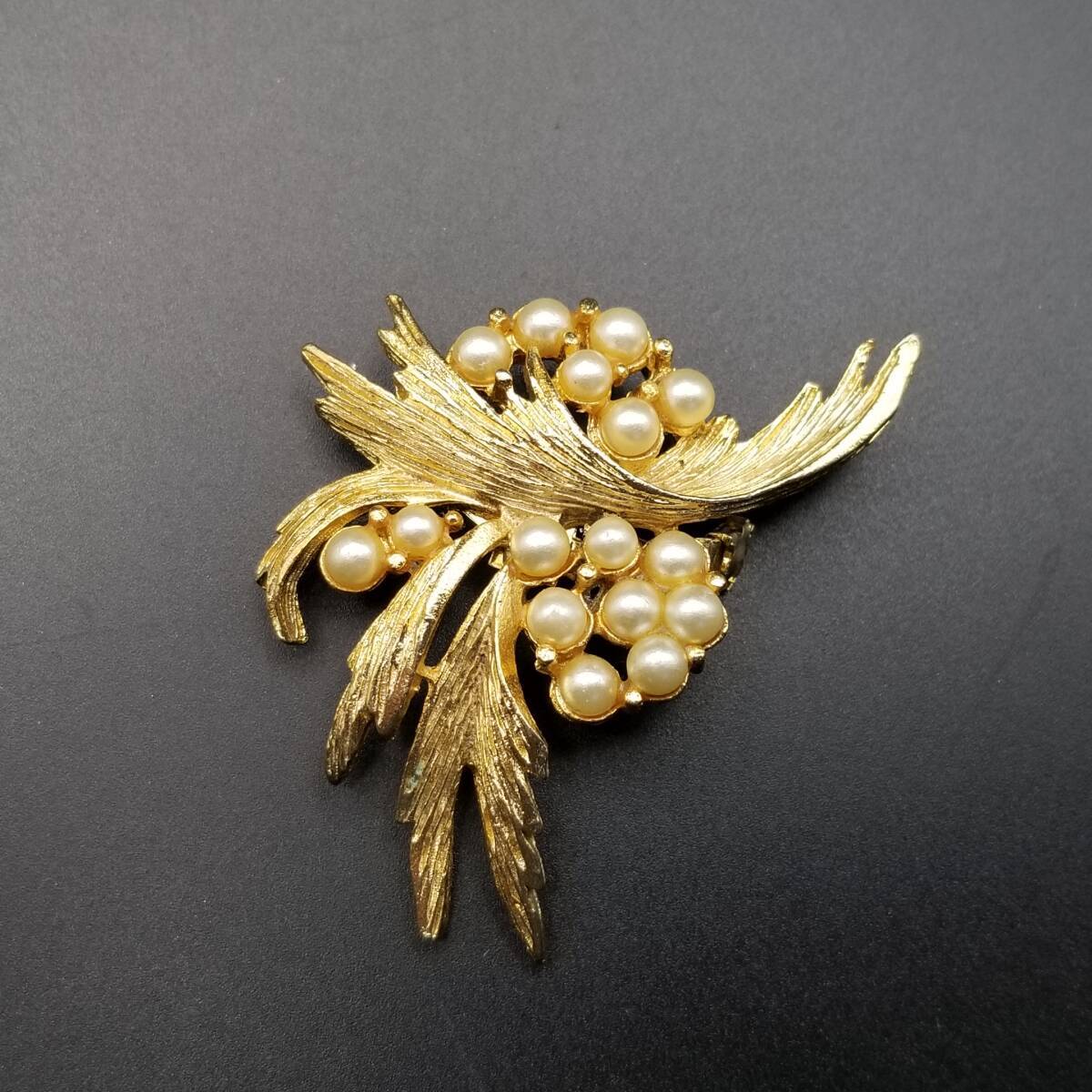 リーフ 植物 モチーフ ホワイト フェイク パール エレガント 上品 ゴールドトーン ヴィンテージ ブローチ ジュエリー 輸入 Y15-R