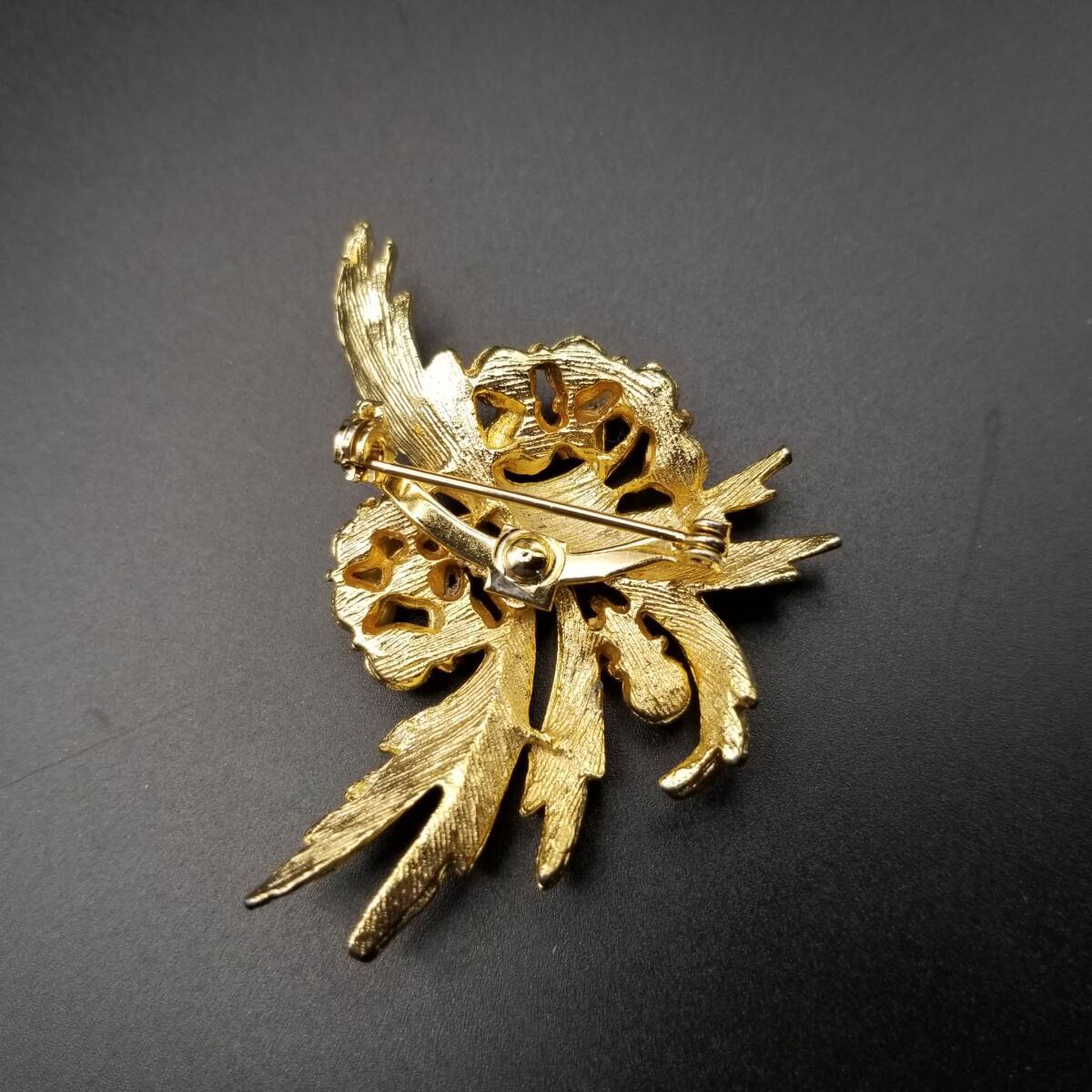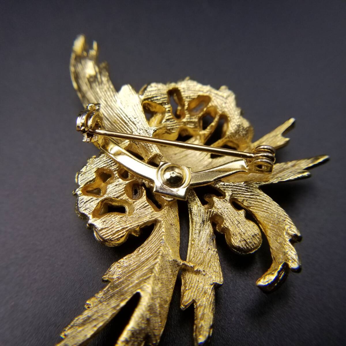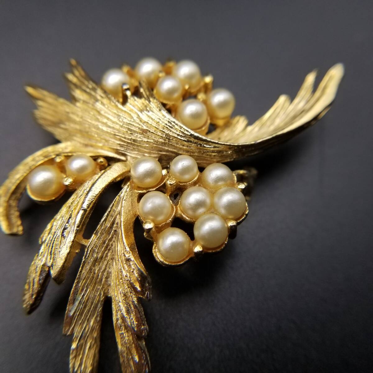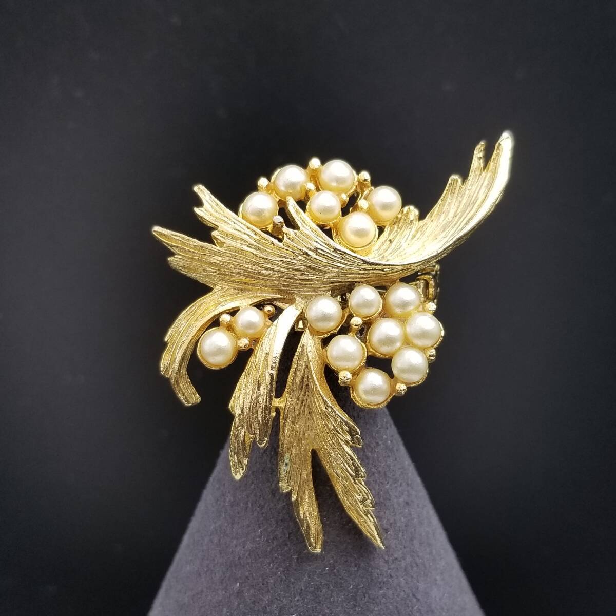 リーフ 植物 モチーフ ホワイト フェイク パール エレガント 上品 ゴールドトーン ヴィンテージ ブローチ ジュエリー 輸入 Y15-R