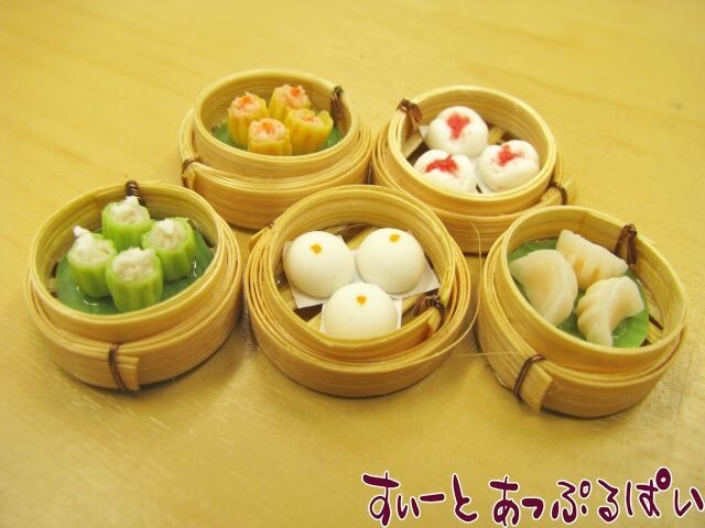 こちら、リバイバル商品です!かわいらしい飲茶が5個セットで、お買い得です!本当に良くできていますよ!餃子の皮の透け具合など、最高です。ぜひお試しを!せいろの直径約20ミリ。※種類が写真と多少異なる場合がございますが、餃子は必ず入ります。飲茶はせいろに接着されています。