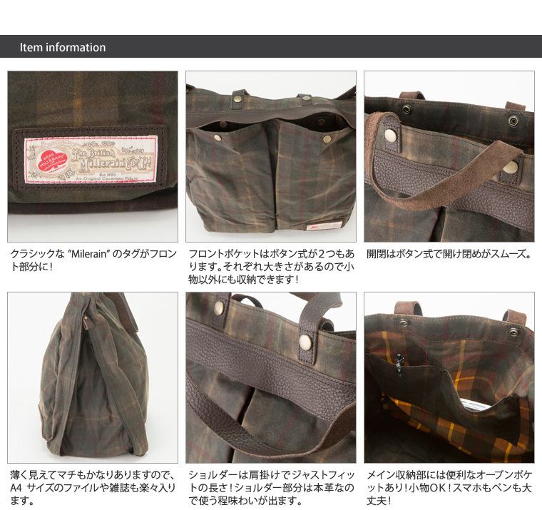 オイルドコットンのパイオニア・ミラレーンの2wayトート! クラシックな”Milerain”のタグがフロント部分に! フロントポケットはボタン式が2つもあります それぞれ大きさあるので小物以外にも収納できます! 開閉はボタン式で開け閉めがスムーズ。 薄く見えてマチもかなりありますので、A4サイズのファイルや雑誌も楽々入ります。 ショルダーは肩掛けでジャストフィットの長さ ショルダー部分は本革なので使う程味わいが出ます。 メイン収納部には便利なオープンポケットあり!小物OK!スマホもペンも大丈夫! [ブランド]Milerain ミラレーン [サイズ]高さ/約40cm 幅/約37cm マチ/約15-22cm [素材]オイルドコットン/本革 [カラー]グリーン [仕様]開閉/ボタン留め 外側/ボタン留めポケット×2 内側/オープンポケット×2 マチ開閉仕様 販売定価:20000円(税別) コンディション:新品未使用品 ※ご注意ください※ オイルドコットンの商品は綿素材にオイル(ワックス)を浸透させております。 オイルを含んでおりますので触れた生地に移染します。 特に薄い色の衣類などを着用の際には充分ご注意ください。 ※ご注意※ 個人保管の未着用新品になります。 保管の際にケース、外箱にダメージ、汚れ等がある場合が あるかも知れませんのでその分安価にて出品させていただいております。 予めご了承のうえご入札くださいますようお願い申し上げます。 ※特価品となりますので、ノークレーム・ノーリターンにてご理解お願致します。 |