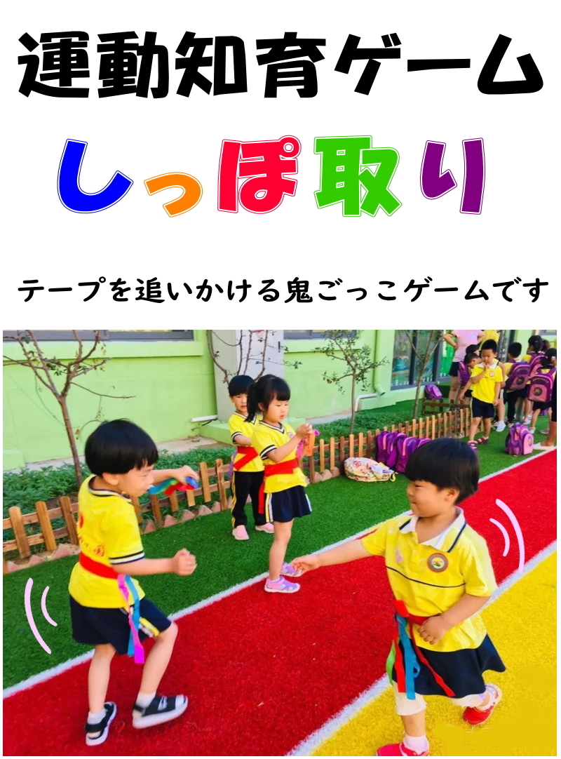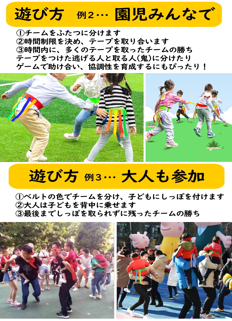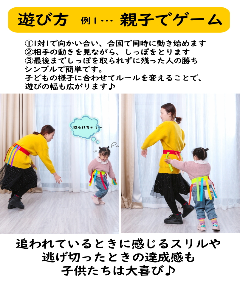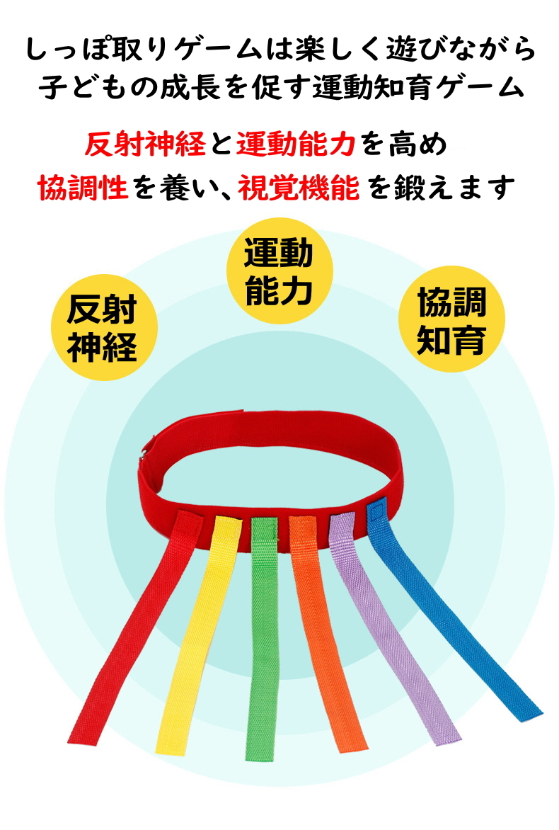 しっぽ取りゲームは、楽しく遊びながら子供の成長を促すゲーム。協調性を養い、競技するおもしろさが感受性を高め、反射能力、運動能力を高める効果があります。
