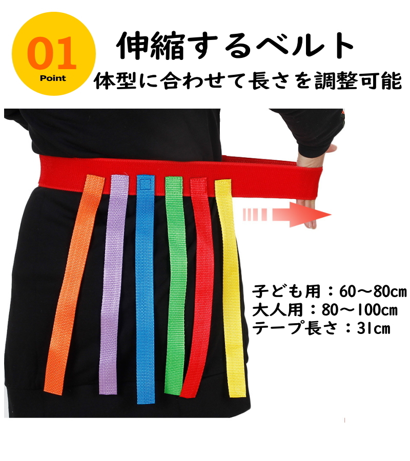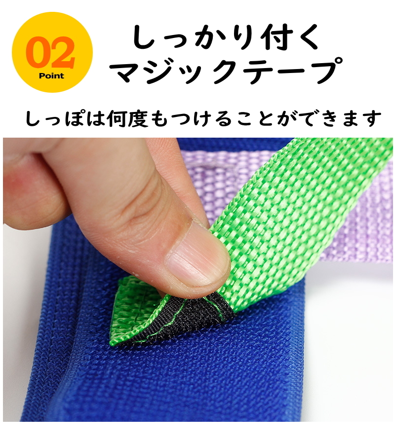 体型に合わせて長さを調節できる伸縮するベルトと6色の何度もつけることができるマジックテープ付きしっぽで遊ぶことができます。