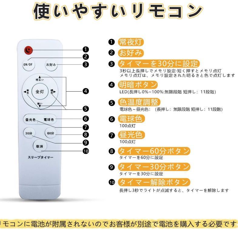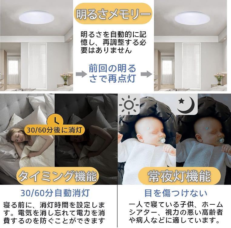 【便利な機能】おやすみタイマー:30分/60分後に自動的に消灯。消灯を忘れる手間が省けます。常夜灯モード:0.5w快適な明るさで、高齢者や夜間の授乳に最適です。明るさメモリー機能:消灯時に自動的に輝度と光色を記憶し、再び点灯すると、直ちに消灯時の輝度と光色で点灯します。これらの機能がより快適な生活をもたらすことを願っています。