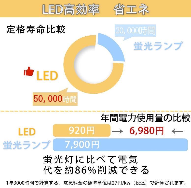 【明るさそのまま、高い省エネ性能】2023年最新型LEDチップを採用し、発光効率が高いため、明るさはそのままに省エネ効果が顕著です!LEDのエネルギー消費量は白熱灯の1/10で、電気代を大幅に節約することは財布にやさしい。LED照明器具の使用寿命は50,000 hで、長期的に交換しないのはお得です。発光が均一で目を保護することができます。早く新しい光源に着替えましょう!