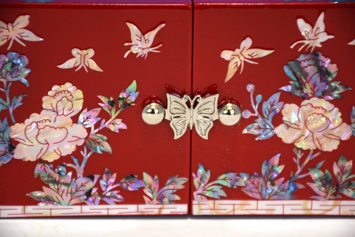 漆塗りの本体に、牡丹の花と蝶の螺鈿細工が贅沢に施されたカラフルな宝石箱です。