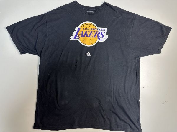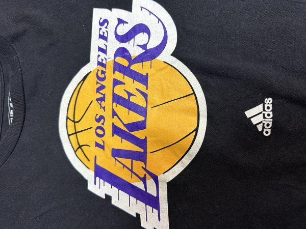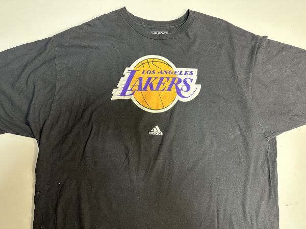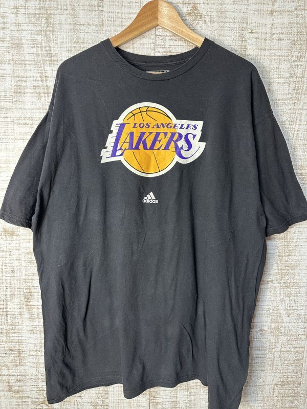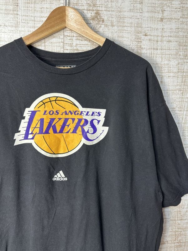 ●US USED 超ビッグサイズ US古着 adidas アディダス LAKERS レイカーズ NBA バスケ チームTシャツ プリント ブラック黒【2XL】コットン