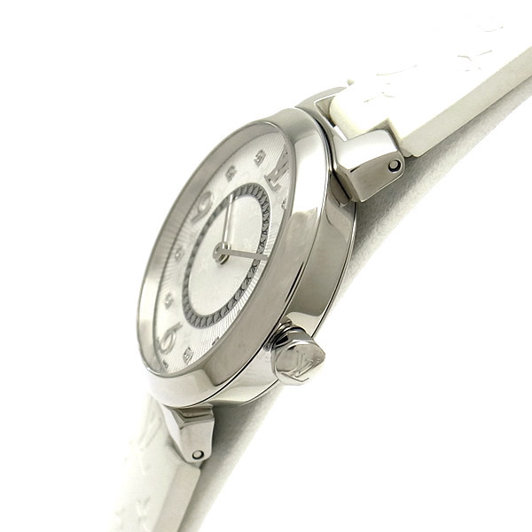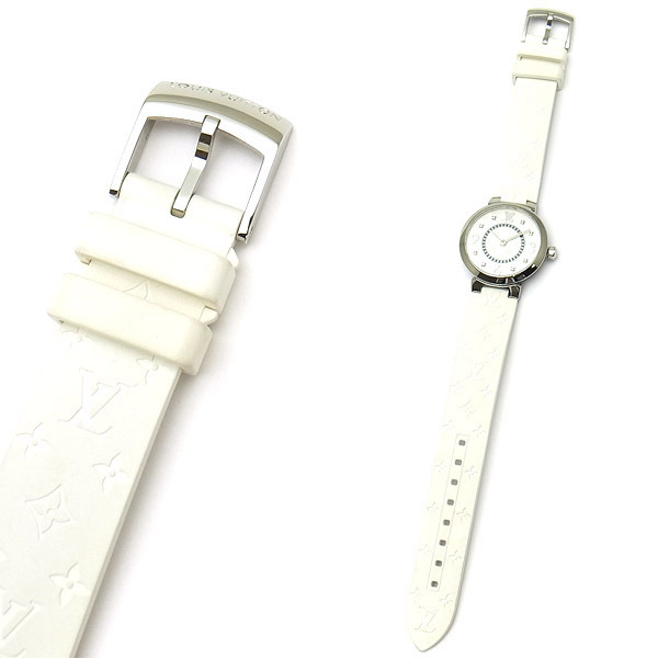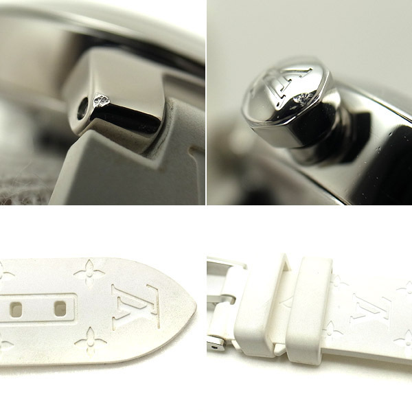 当社指定時計修理業者にて外装仕上げ済みの為、大きく目立った傷はありませんが、僅かな微傷が光の当たり具合で分かる程度ですが御座います(画像参照)。純正のホワイトラバーバンドは、使用に伴った薄っすらとした多少の汚れは御座いますが、そこまで気になる感じではないかと思われます。また、こちらタイプのベルトはご自身で簡単に脱着が可能なモデルのですので、ルイヴィトンにて違う種類をお買い求め頂ければ、その時の気分でベルトをご自身で交換して楽しむことが出来ます。