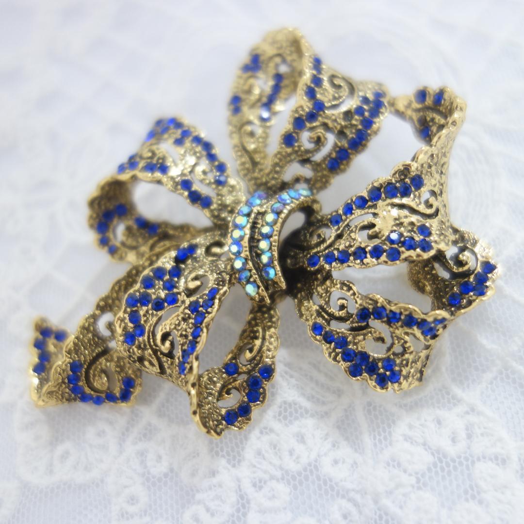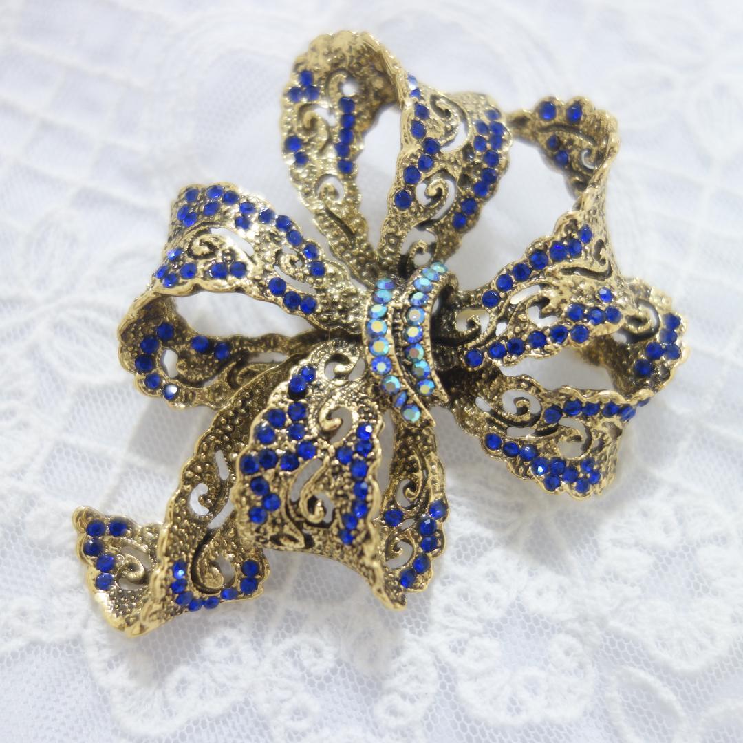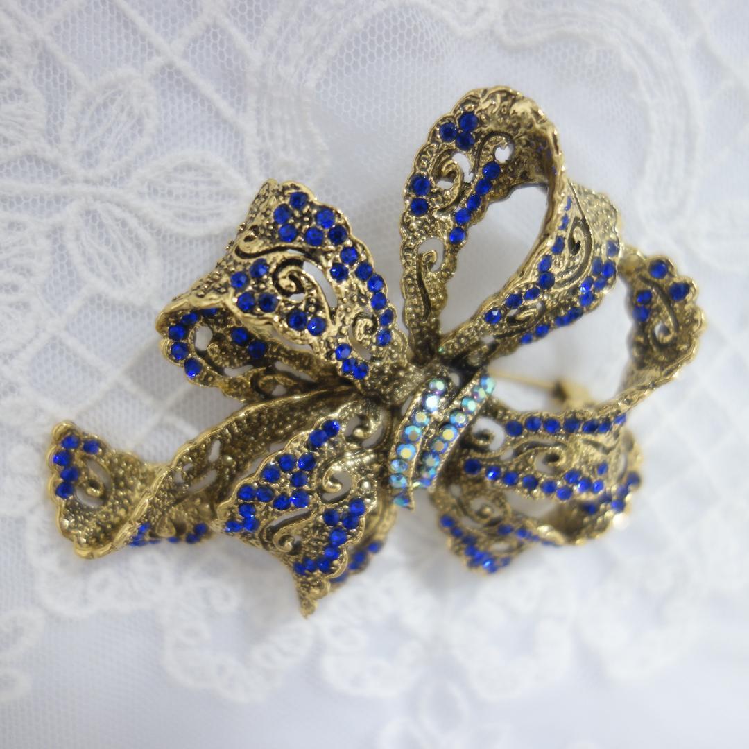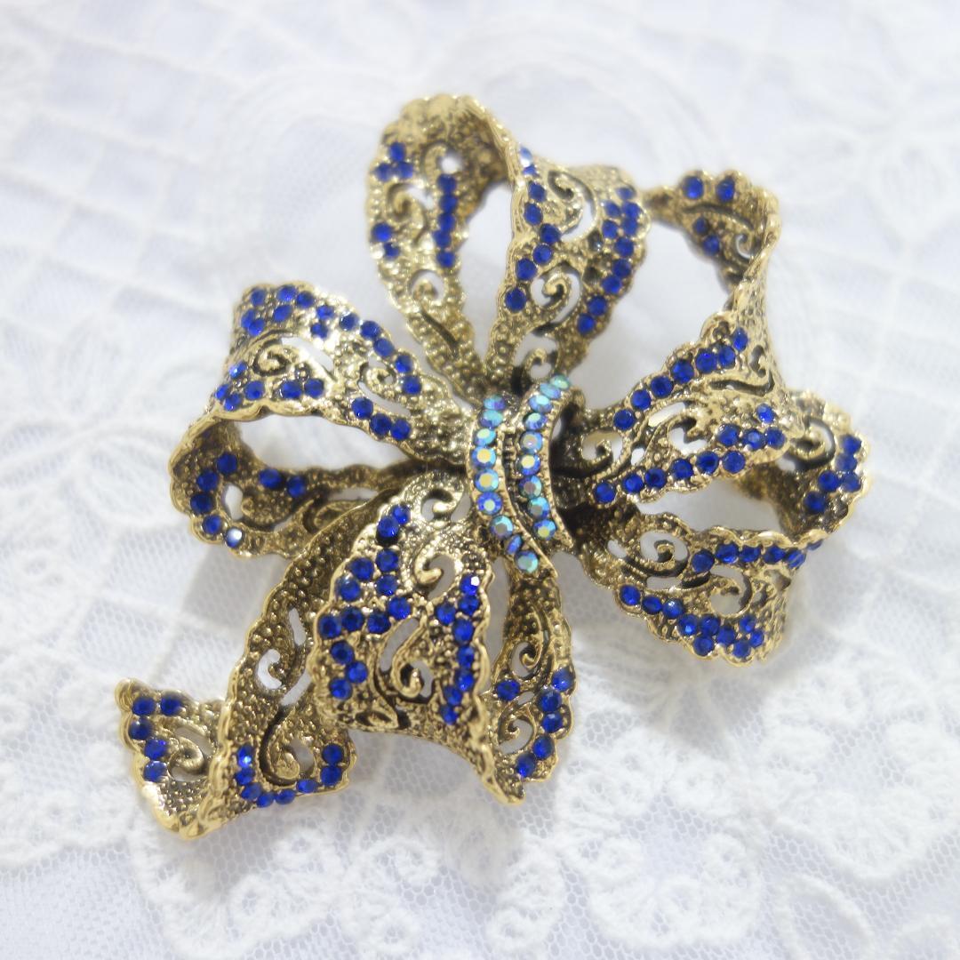サファイア色&ルビー色輝石 アンティーク調 リボン ブローチ 立体的 ブローチ