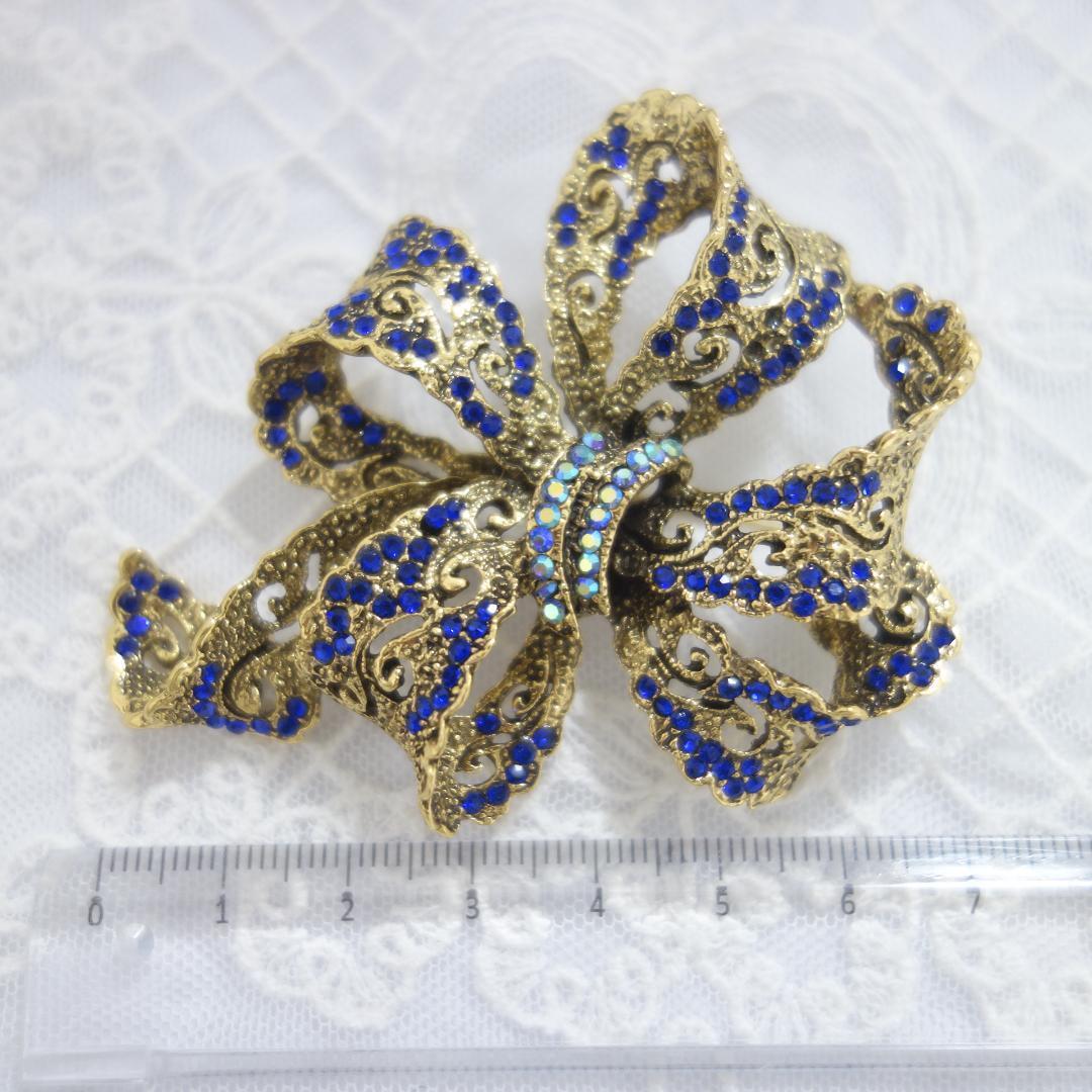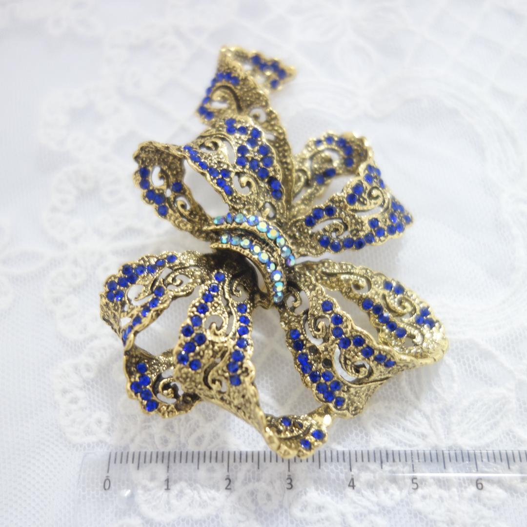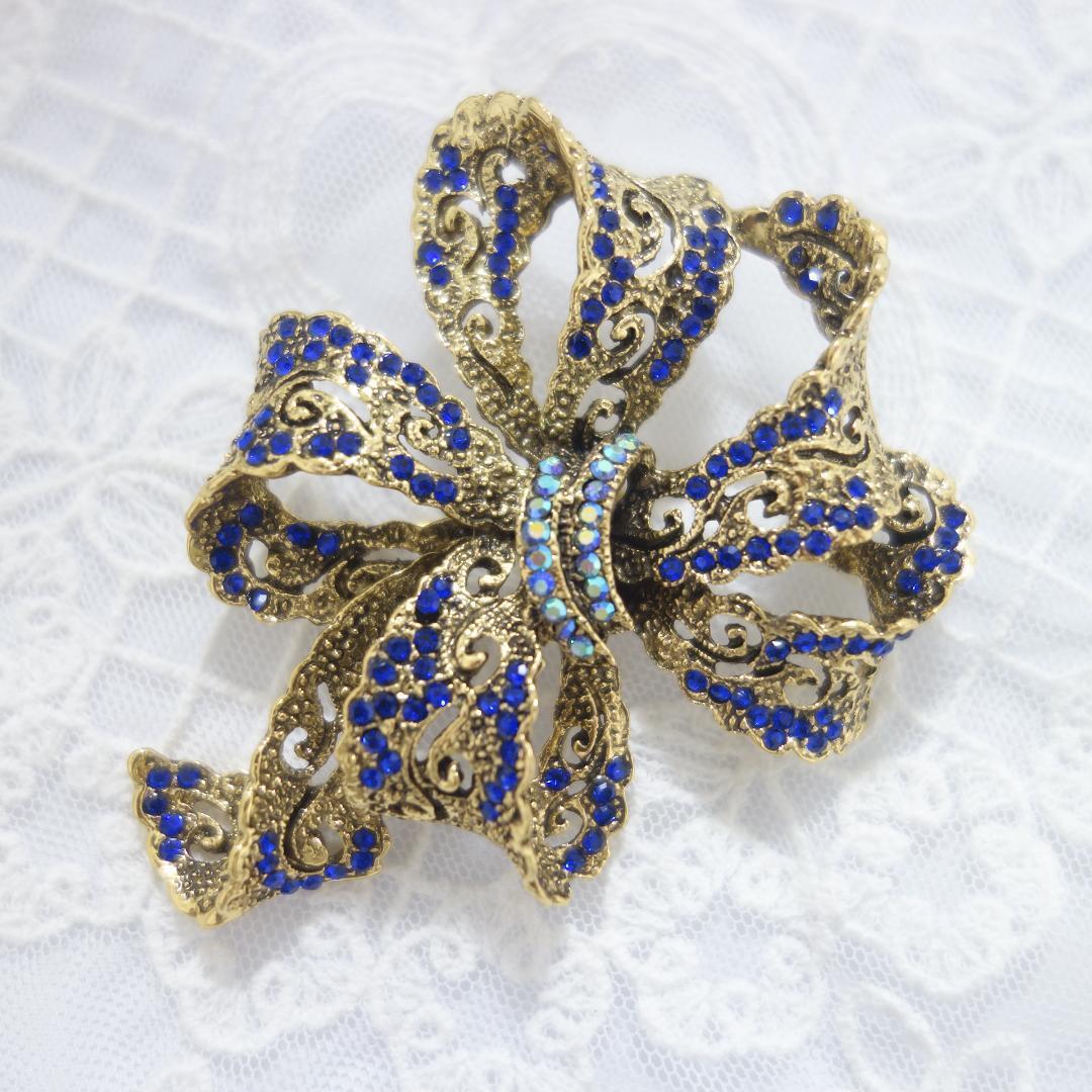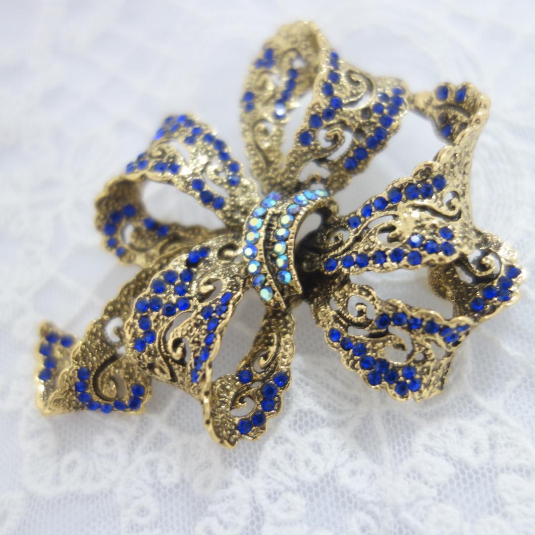サファイア色&ルビー色輝石 アンティーク調 リボン ブローチ 立体的 ブローチ