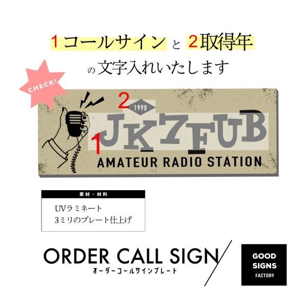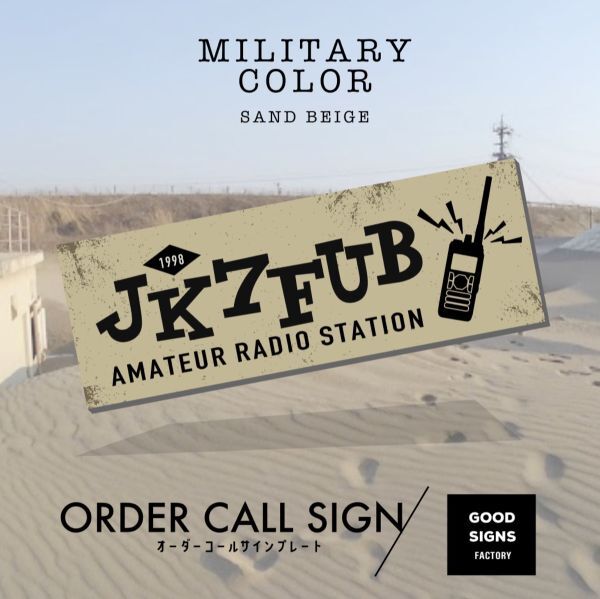 【オーダーコールサインプレート】ミリタリーサンドベージュ①無線イラスト付き 文字入れ uv加工 アマチュア無線局