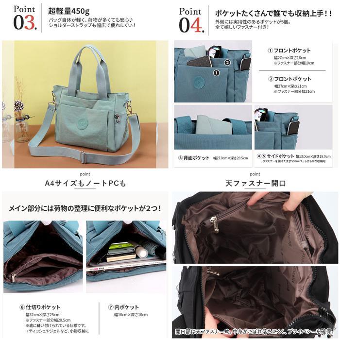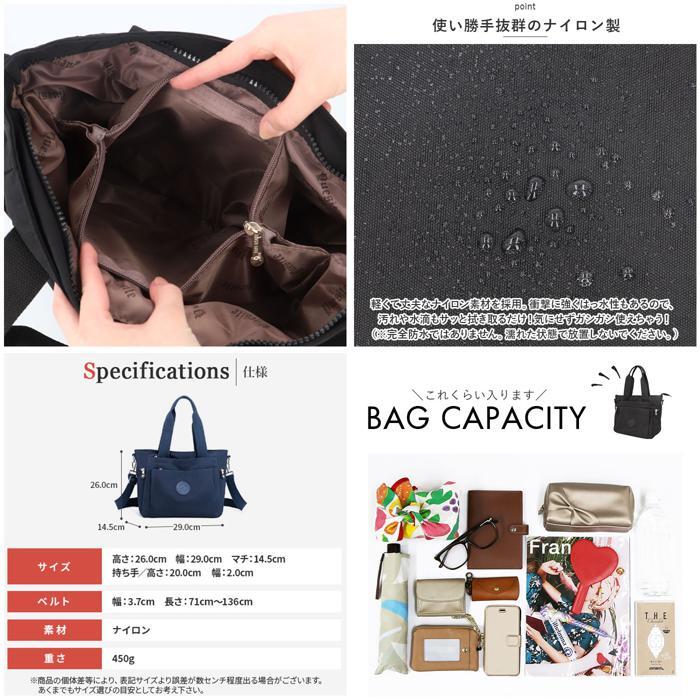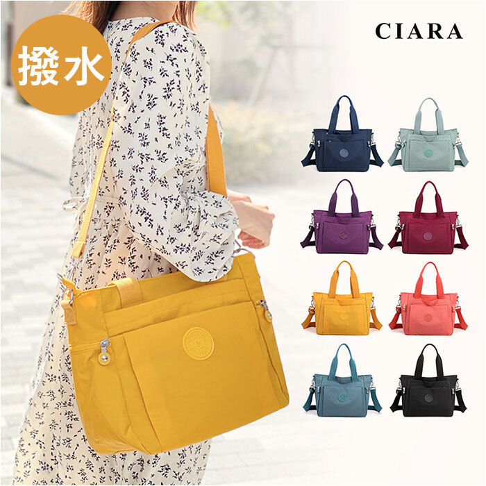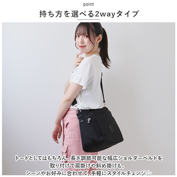 商品説明 | ・・すっきり収納♪オン・オフ問わず使える「CIARA 2WAYトートバッグ」が新登場。 ・【ちょうどいいサイズ感】 ・大きすぎず小さすぎない!お出かけに必要な小物がしっかり収まるのが嬉しい! ・【持ち方を選べる2wayタイプ】 ・トートとしてはもちろん、長さ調節可能な幅広ショルダーベルトを取り付けて肩掛けや斜め掛けも。シーンやお好みに合わせて、手軽にスタイルチェンジ☆ ・【天ファスナー開口】 ・開口部は天ファスナー式。中身がこぼれ落ちにくく、プライバシーを確保。 ・【便利な2ルーム仕様】 ・内側は仕切り付きの2ルーム仕様。手軽に整理整頓できるのがポイント。 ・【A4サイズもノートPCも】 ・A4サイズのファイルや13インチのノートPCが収納可能。マチが広く、見た目以上の収納力! ・【小物が迷子になりにくい!】 ・内側・外側合わせて7個のポケットを装備!必要なときにサッと取り出しOK。 ・【使い勝手抜群のナイロン製】 ・軽くて丈夫なナイロン素材を採用。衝撃に強くはっ水性もあるので、汚れや水滴もサッと拭き取るだけ!気にせずガシガシ使えちゃう!(※完全防水ではありません。濡れた状態で放置しないでください。) ・【細部までこだわりのディテール】 ・デザイン性のあるファスナー引き手や、フロントのワンポイントロゴがおしゃれ。 ・【使い方はあなた次第】 ・お出かけや旅行、通勤・通学、マザーズバッグなど、マルチに活躍! ・【お気に入りをチョイス】 ・ベーシックカラーやアクセントになるカラーをラインナップ。どんなコーデにも合わせやすいシンプルなデザイン◎ ・【ポケット仕様】 ・内側:ファスナーポケット×2 ・前面:ファスナーポケット×2 ・サイド:ファスナーポケット×2 ・背面:ファスナーポケット×1 |