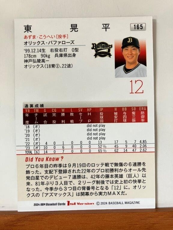 【2024 BBM 1st】165東晃平(オリックス・バファローズ)レギュラーカード※キラカード版