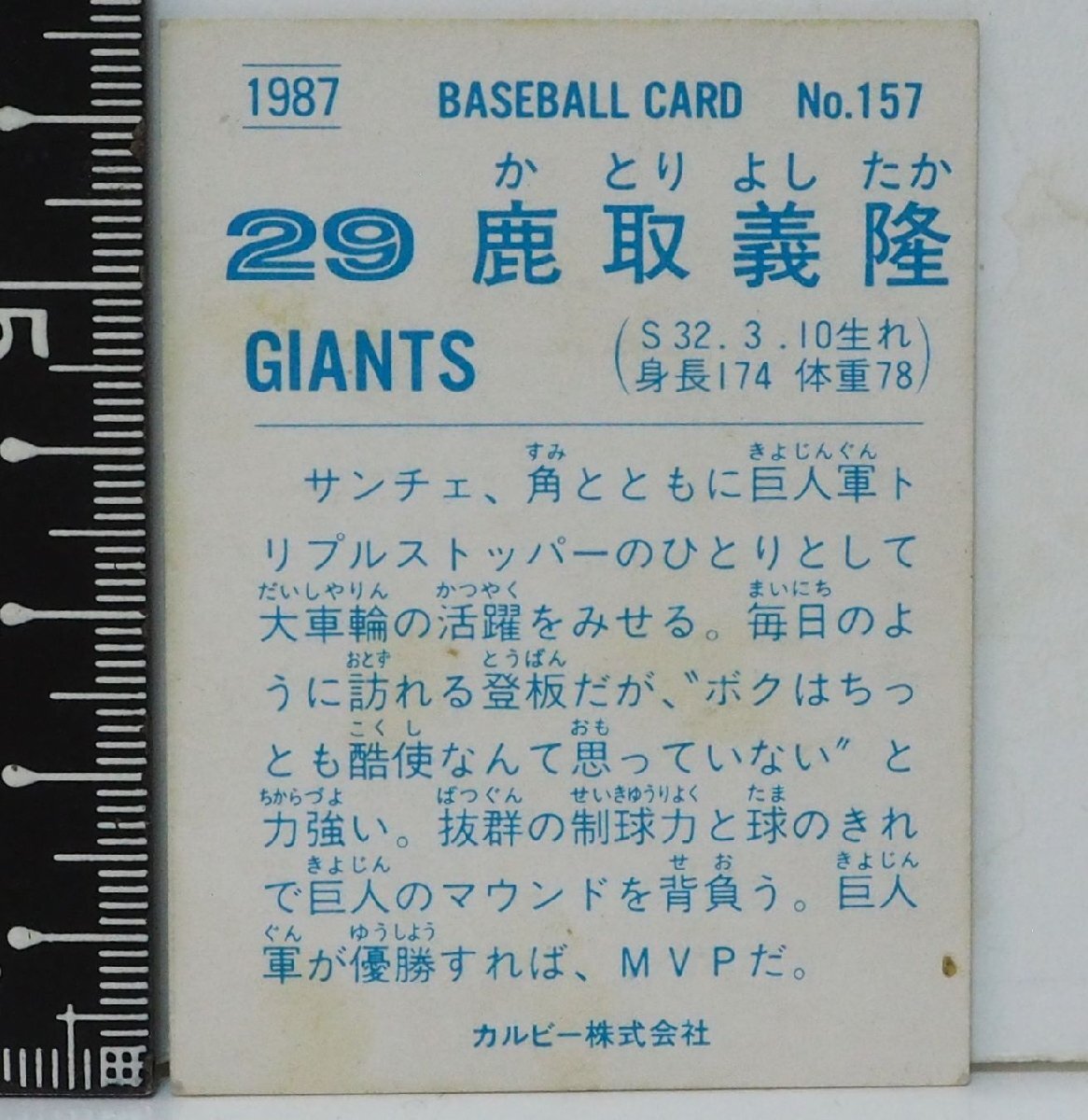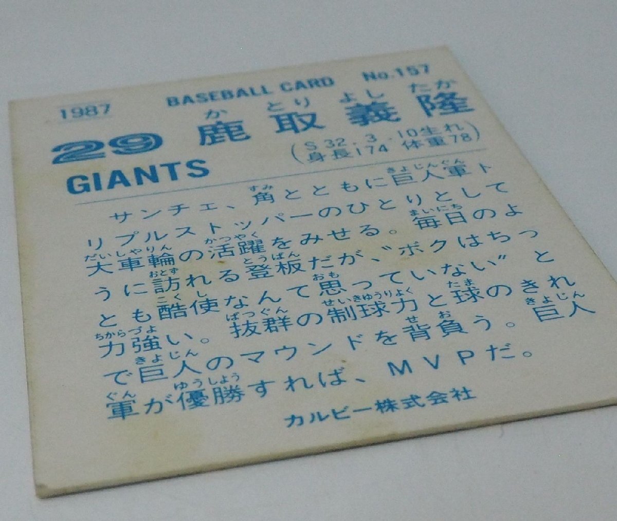 87年 カルビー プロ野球カード No.157【鹿取 義隆 読売ジャイアンツ巨人】昭和62年 1987年 当時物 Calbeeおまけ食玩BASEBALL【中古】送料込