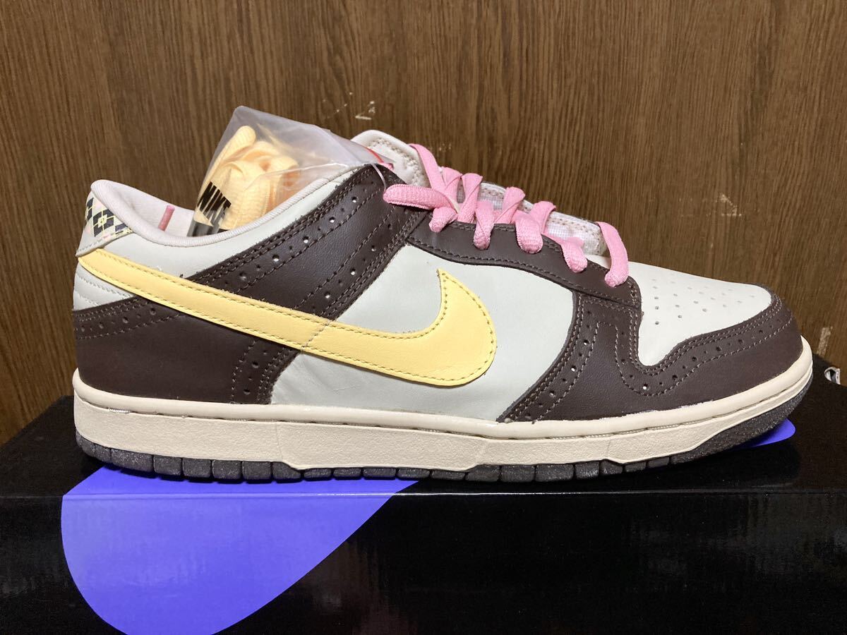 アッパーはブラウンレザー×ベージュレザー、SWOOSH はイエローレザーです。