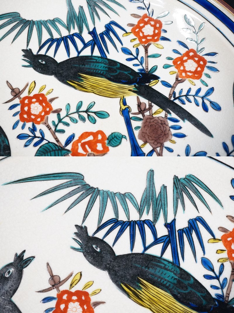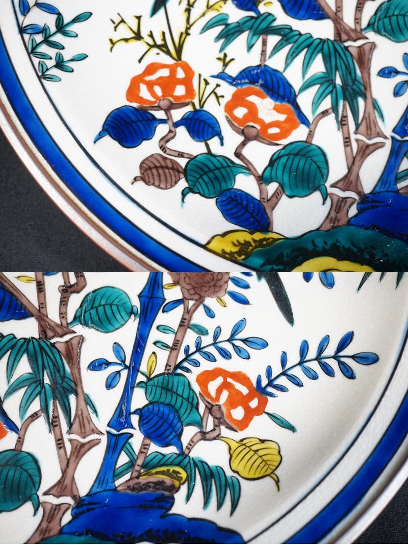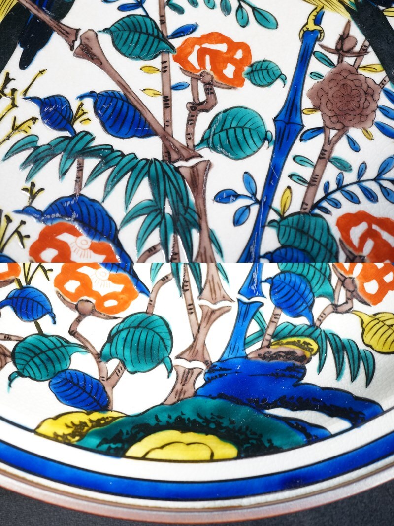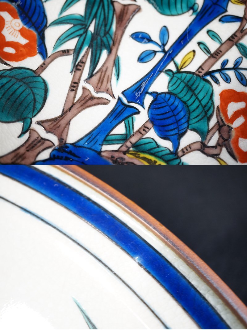 ■東ハ:【九谷焼】角福銘 色絵 哥々鳥図 飾皿 約31.5㎝ 叭々鳥図写し 八哥鳥 花鳥図 吉祥図 大皿 飾り皿 ★送料無料★■ 九谷焼 角福 銘入り「 色絵 哥々鳥図 飾皿 」叭々鳥図写し 大皿になります。 【九谷焼】 九谷焼は、日本を代表する色絵陶磁器です。その特徴であり、最大の魅力は「上絵付け」です。 「上絵付けを語らずして九谷はない」と言われるほど、色絵装飾の素晴らしさは、豪放華麗です。 九谷焼の上絵付けの特徴は『赤、黄、緑、紫、紺青』の、五彩手(通称九谷五彩)という、 みごとな色彩効果と優美な絵模様に表れています。 その他、『緑、黄、紫、紺青』を使用した青手古九谷の塗埋手など、 色彩のハーモニーが魅力です。 【サイズ】 (約) 高さ4.6 × 幅31.5 ×奥行31.5 cm 【コンディション】 中古のお品となります。 付属品は写真にあるものが全てです。 使用に伴うキズが複数ございます。 当店では、古いものを扱っておりますため、時代経過による汚れ・スレなどがございます。 新品(完全品)をお求めの方は、ご入札をお控えください。 状態につきまして、不明な点などございましたら商品説明欄の質問欄より事前にお気軽にご質問ください。 画像をよくご覧になられお客様のご納得の上、責任を負える範囲でのご入札をお願い致します。 ■商品画像について■ ご使用モニター環境などによっては、多少色合いなどが異なって見える場合がございます。 予めご了承いただけますようお願い申し上げます。 商品画像をよくご確認の上、ご参加ください。 [管理No.24051761R1] |