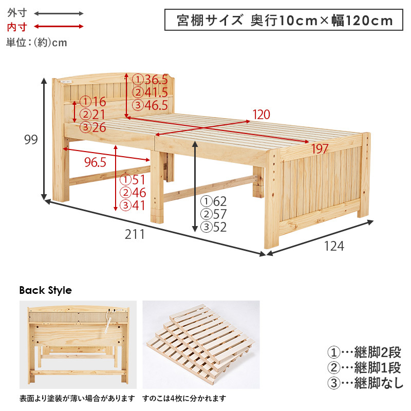 ベッド:(約)幅124×奥行211×高さ99×床面高52/57/62cm