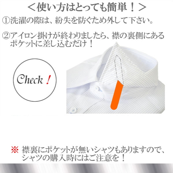 ワイシャツの襟の形を整え、襟元の形をいつまでも美しく保つ、襟の骨的役割を果たします。